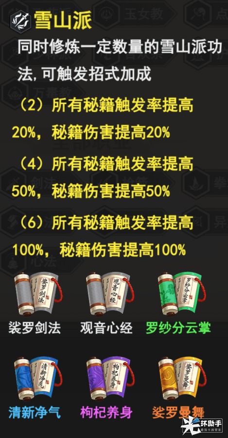 4、6雪山派,提升秘籍触发概率和秘籍伤害,剑法“一剑开天”,刀法“纯阳刀法”升到2星解锁的秘籍技能配合起来,可以打出高额伤害