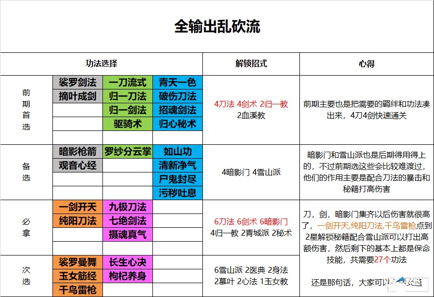 1、6刀法必拿,提高暴击率,简单粗暴,配合“暗影门”提高的暴击伤害,可以打出非常高额的伤害。刀法的功法共有7个,拿6个即可,月蚀刀法可以不用拿,不过具体也看发牌员的情况