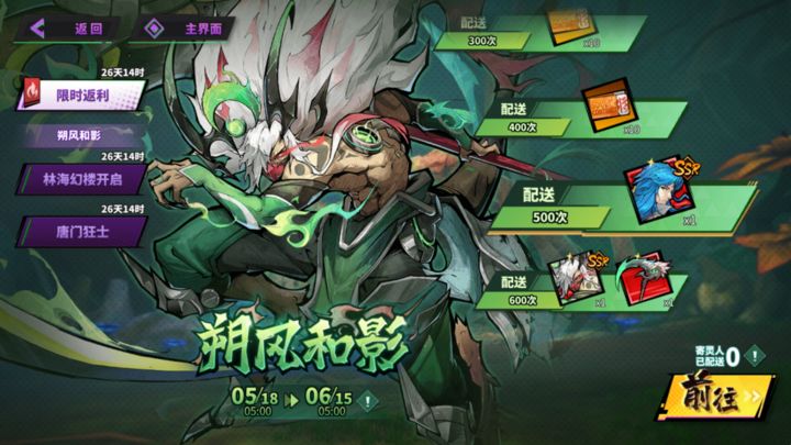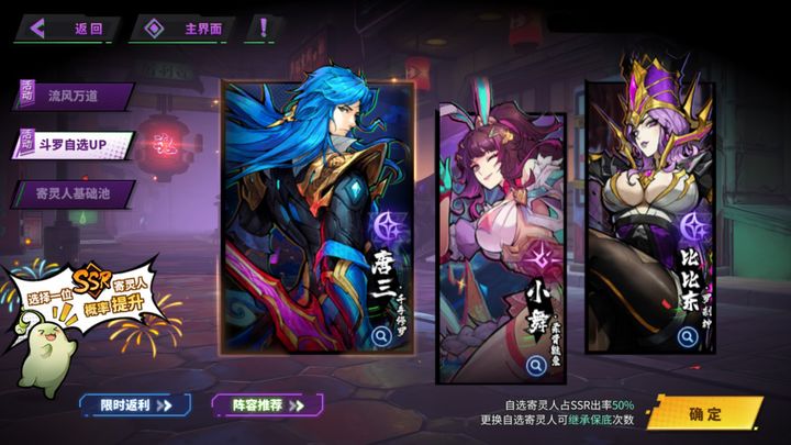 活动期间,镇魂将可选择SSR角色「唐三·千手修罗」「小舞·柔骨魅兔」「 比比东·罗刹神」中的一位提升配送获取概率。