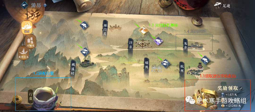 不要小看看似休闲的游历玩法,给到的奖励远远超出小编预期!除去经验,交子,好感度礼物,寻侠贴,天外陨铁,绑玉等常规奖励;还可以获取百炼装备,首领密藏,群侠技能,百家技能(有悔刀法/酣饮忘尘)等稀有道具。