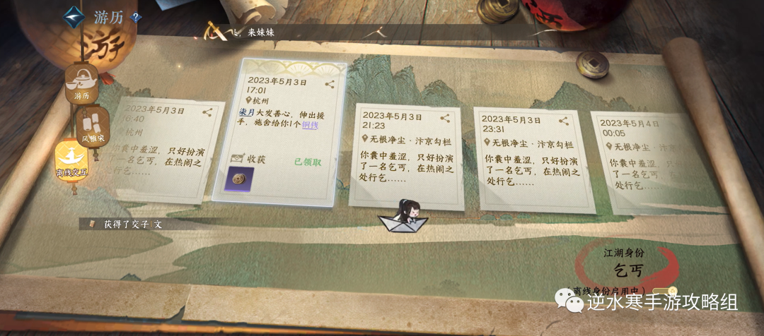 玩家基于百业卷中获得的隐藏身份在江湖大世界开启离线游历,并与其他玩家发生互动。例如:解锁采摘玩法中的隐藏身份"乞丐",离线后角色会在游戏世界中对其他玩家乞讨,上线后可查看并领取收益。