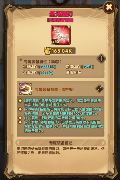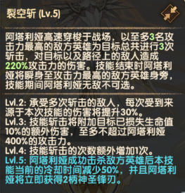 阿塔利娅每获得5柄神圣锋刃,将永久提升己方英雄造成的伤害和若干点破防。己方英雄受到控制效果时,将对控制效果来源造成伤害并且使目标在后续一段时间内无法回复能量。