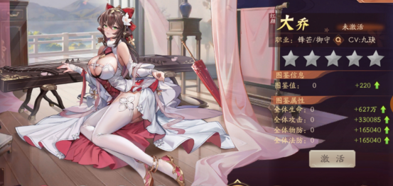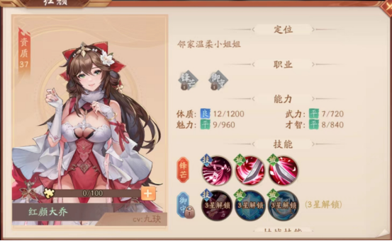 首先,红颜四维面板带来的都代表什么提升,小编已经反复讲过多次了,不再赘述。我们来看大乔,首先资质上作为天金+,红颜资质高达37,与上一位红颜张星彩一致,职业为锋芒/御守,那么三星前的大乔对于阵容的输出有更大的提升,三星后则可以选择改为御守职业,弥补攻防数据与续航。从能力上,武力、魅力、才智初始的资质为平,但是体质的资质为良,那么在体质上,大乔的体质峰值会更高。所以小编建议,在日常红颜出游活动中,玩家可在增添在体质的出游中,消耗更多次数。