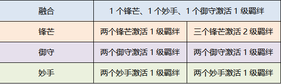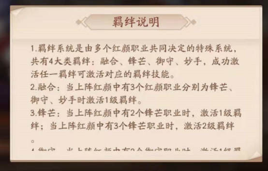 通过红颜的上阵,则可以激活红颜所独有的羁绊,通过多个红颜的职业来共同决定,成功激活相关羁绊,可获得对应的羁绊技能。融合羁绊需要三种方向职业各自一个来激活,而锋芒、御守、妙手则需要同样职业的红颜通过数量区别来分别激活1级和2级的羁绊。