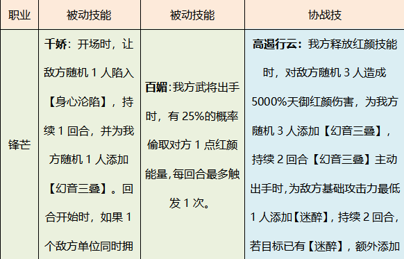 接下来,如果想要充分了解大乔,首先我们来讲解红颜的职业技能,详细了解红颜可以带来什么效果。首先小编将大乔的被动技能与协战技,做出如下统计,便于解读:
