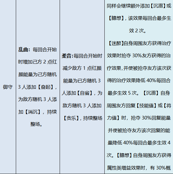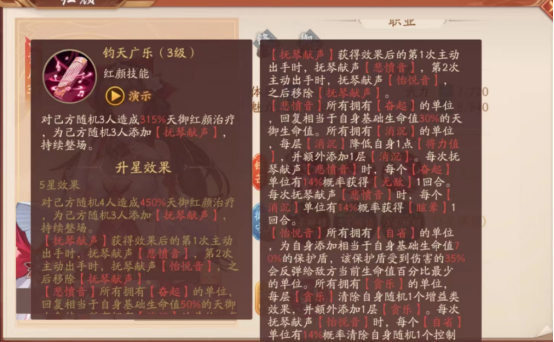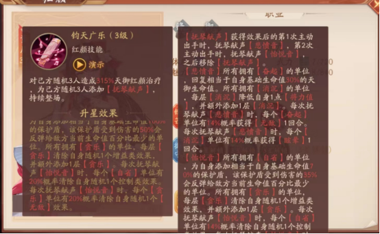 【悲愤音】所带来的基础生命值的恢复,无疑是又一味强心剂,让友军可以进一步优化生存环境,而同时对于具备【消沉】的单位还会降低将力值,而概率的友军无敌,与敌军的眩晕,更是让战局中的敌军雪上加霜,沉迷在琴音中,“享受”自己的慢性死亡。【怡悦音】则在施加高达70%的护盾的同时,该护盾受到伤害的35%会反弹给敌方当前生命百分比最少的单位,加速打开敌军的缺口,以此来击溃敌军。