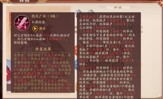 三星后的大乔,会激活御守职业,对于己方随机4人高达450%的天御红颜治疗,让友军具备实战持久力,与敌军抗衡到底。同时大乔抚琴所带来的【悲愤音】、【怡悦音】更是给予友军无穷的能量。(美女总能激起男人的战斗力~)