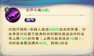 对敌方随机1名敌人造成545%的伤害,对生命百分比高于自身的目标额外造成该目标生命上限15%的伤害(上限为自身攻击15倍);同时自身暴击提升40%,持续3回合。
