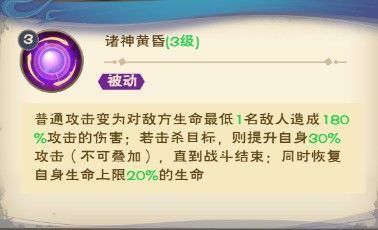 普通攻击变为对敌方生命最低1名敌人造成180%伤害;若击杀目标,则提升自身30%攻击(不可叠加),直到战斗结束;同时恢复自身生命上限20%的生命。