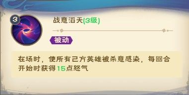 在场时,使所有己方英雄被杀意感染,每回合开始时获得5/10/15点怒气。