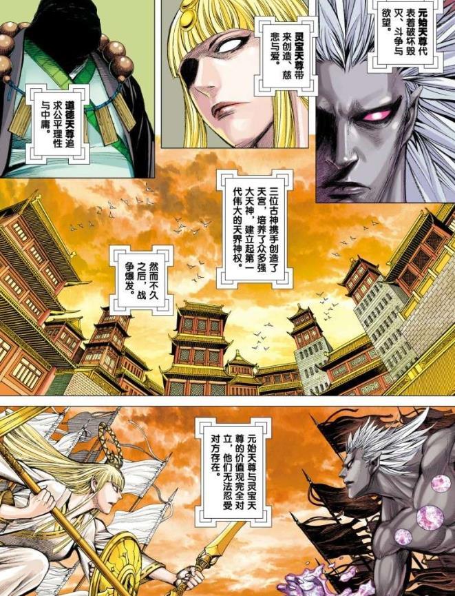 但元始天尊与灵宝天尊的价值观完全对立,两者都无法容忍对方的存在,于是他们的战争打响了,一打就是一百多年,直到道德天尊出手调停,三大天尊订下协议,不再插手干预天宫事务,自此沉睡,成为了天界传说中的「三清」。