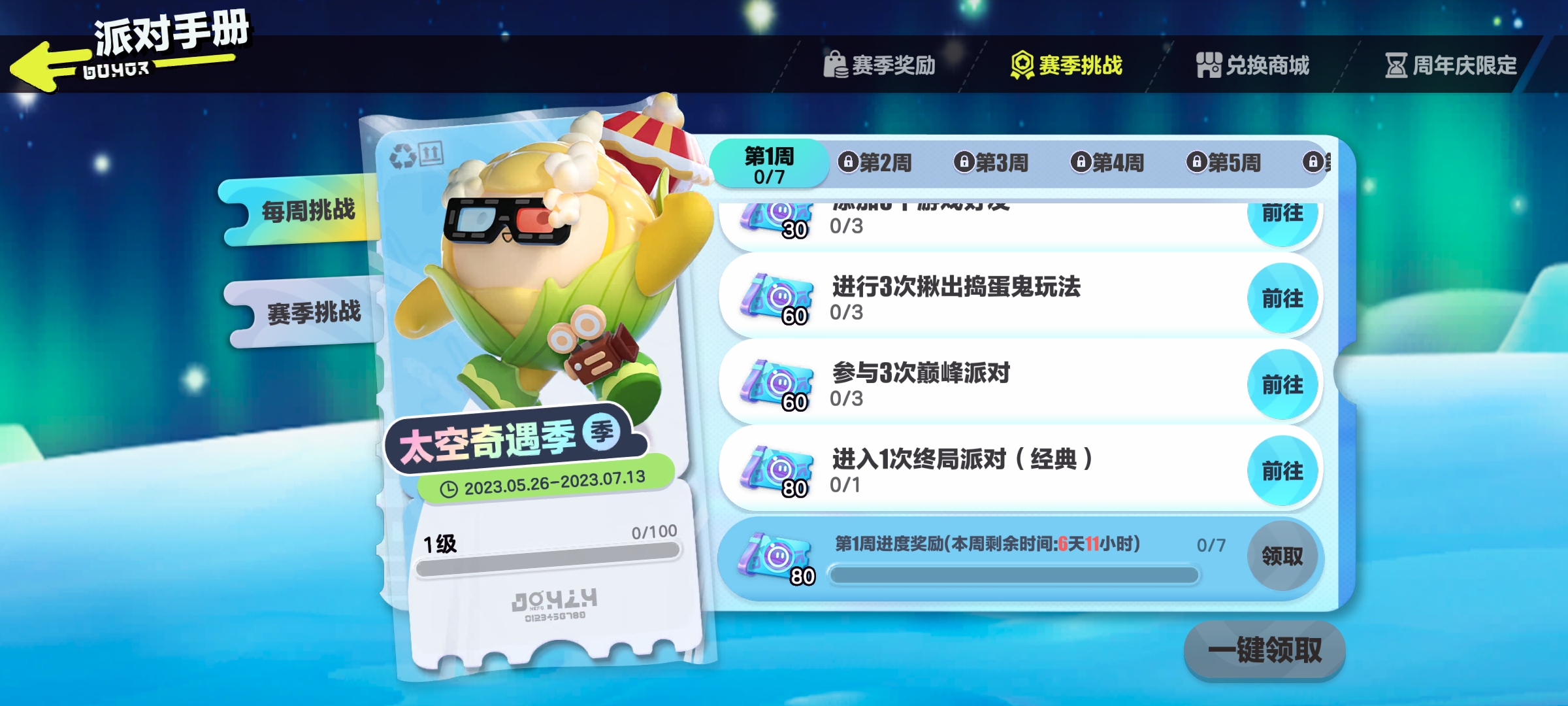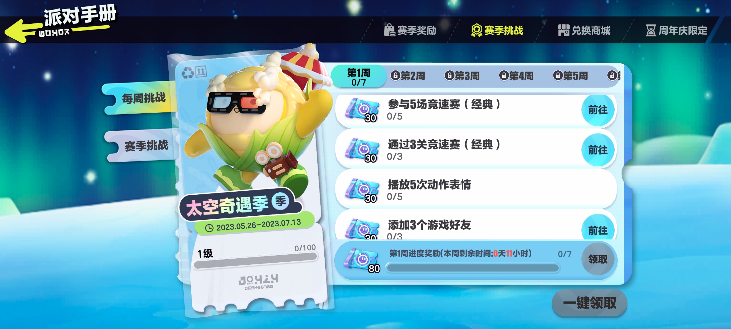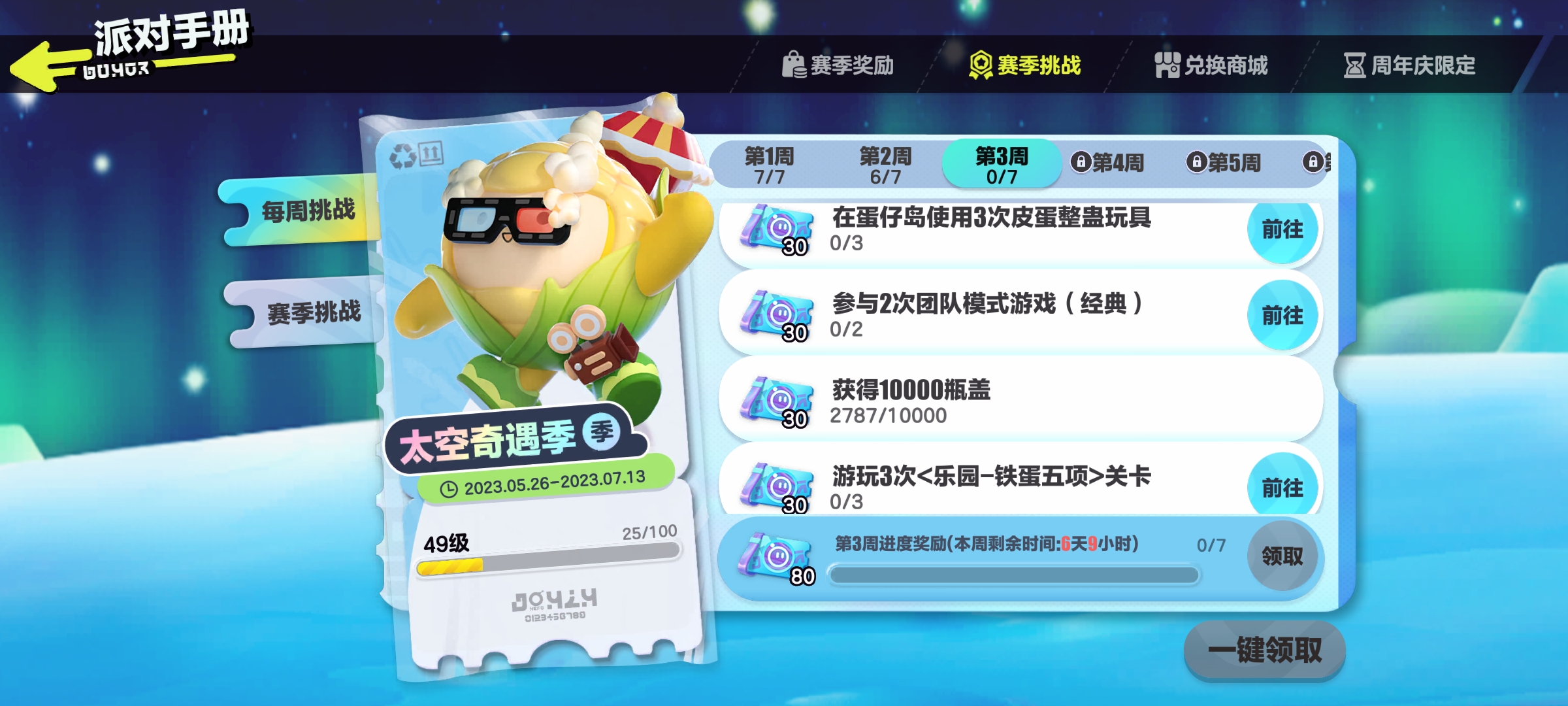 S10太空奇遇记手册更新(未完结)奶茶喝饱嗝发布于 2023-05-26关注S10赛季太空奇遇记手册时长:2023.5.26-2023.7.13提示:活跃挑战及参赛挑战均为赛季更新,赛季挑战每周更新═—═—═—═—═赛季兑换—═—═—═—═— 赛季蓝皮:═—═—═—═—═赛季任务—═—═—═—═—5.26-6.2 6.2-6.9 6.9-6.16