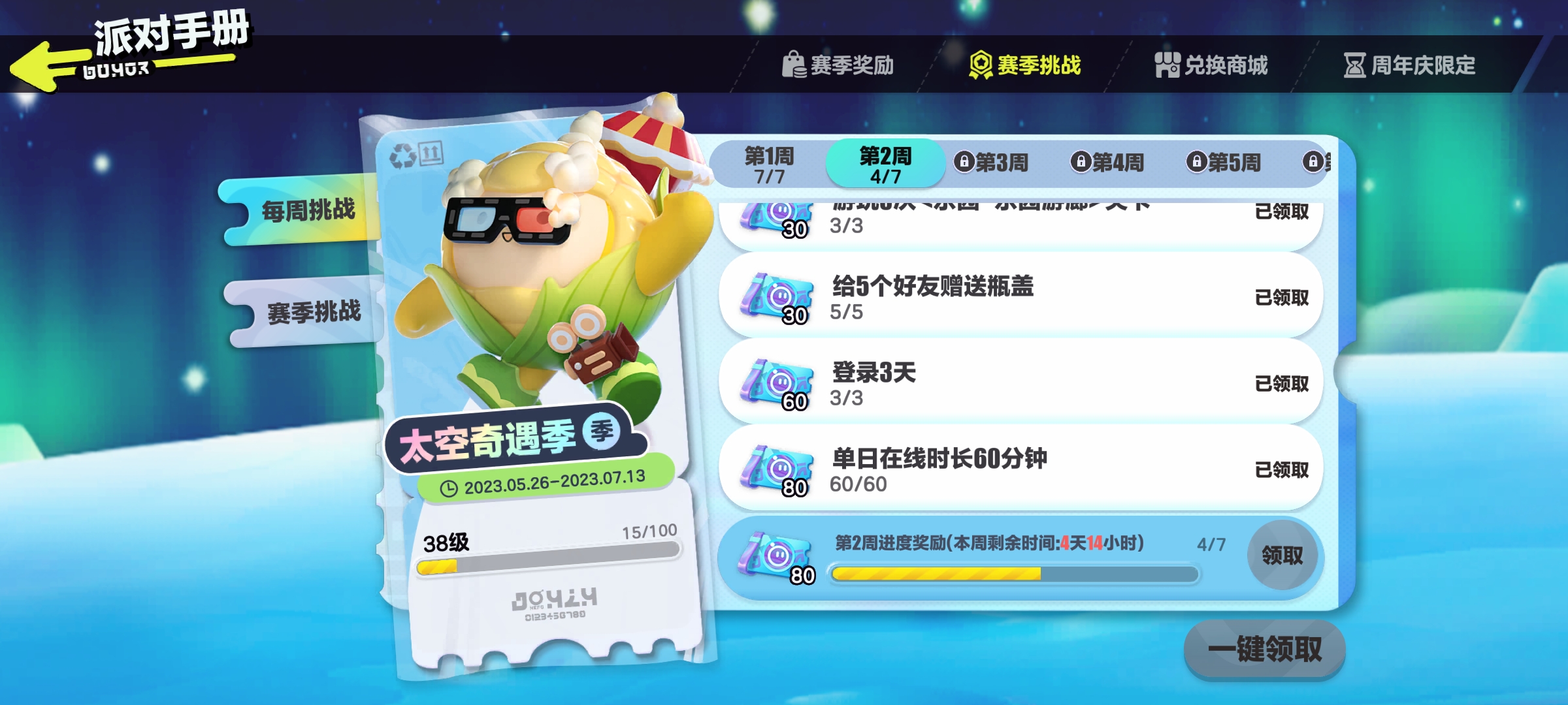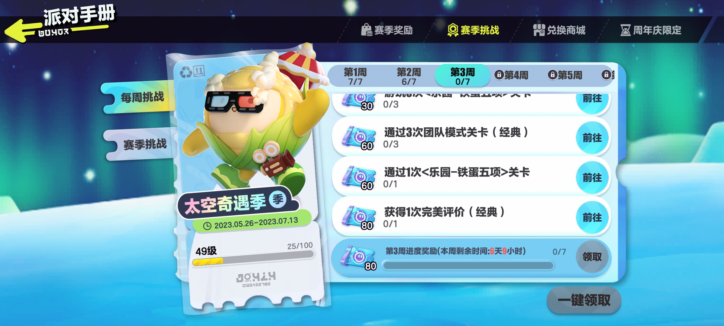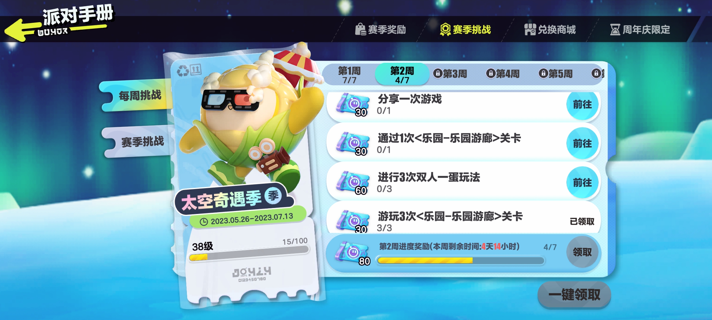 S10太空奇遇记手册更新(未完结)奶茶喝饱嗝发布于 2023-05-26关注S10赛季太空奇遇记手册时长:2023.5.26-2023.7.13提示:活跃挑战及参赛挑战均为赛季更新,赛季挑战每周更新═—═—═—═—═赛季兑换—═—═—═—═— 赛季蓝皮:═—═—═—═—═赛季任务—═—═—═—═—5.26-6.2 6.2-6.9 6.9-6.16