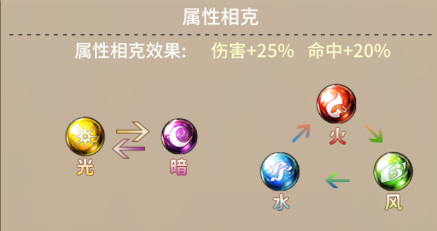 当日,英雄的属性是有作用的,比方说在战斗中,是存在克制的,如图一样,水,火,风是逐步克制的,而光和暗是互相克制的,所以通过属性克制也可以获得一定的胜率。