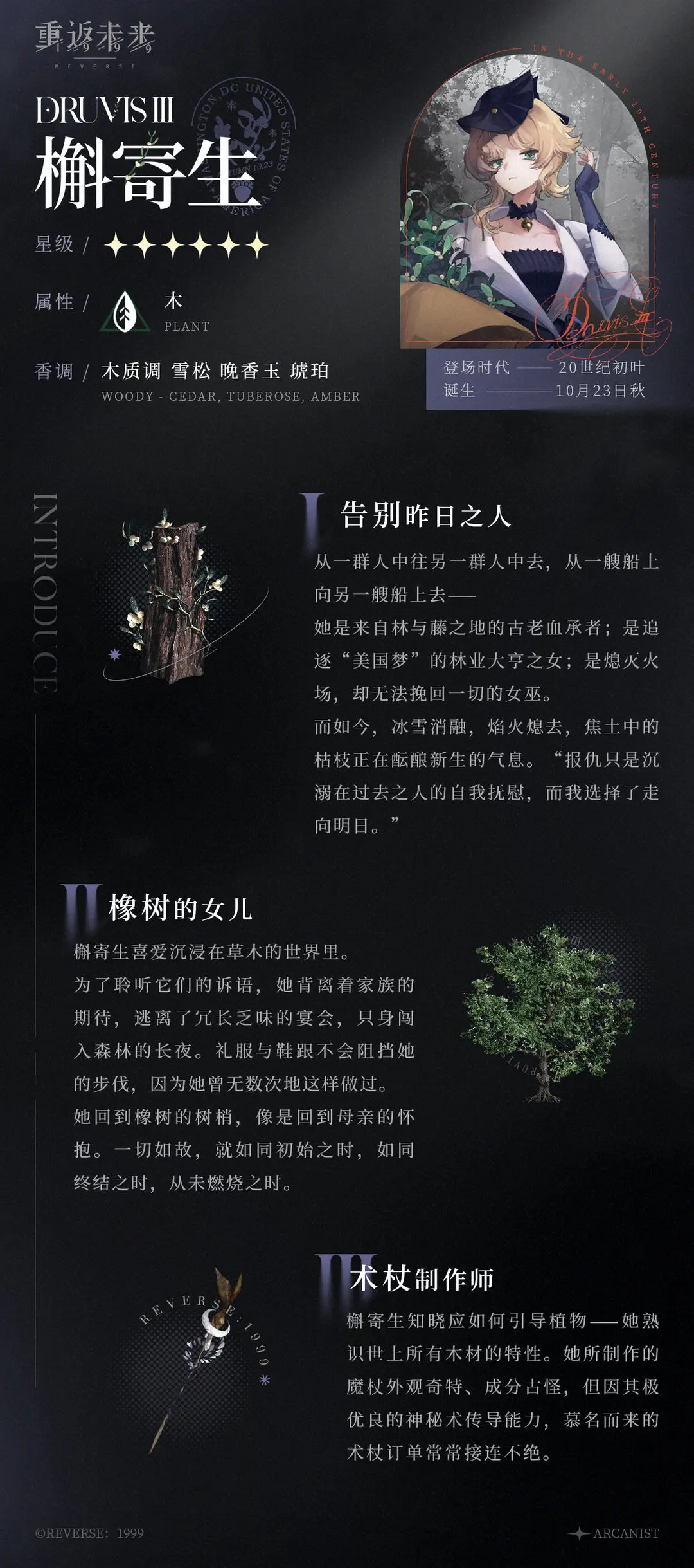 神秘学家 | 槲寄生零零惶惶发布于 2023-05-27关注槲寄生 | Druvis Ⅲ“礼服与鞋跟不会阻挡我的步伐,我能在林间跳跃,因为我曾经无数次地这么做过。” 从一群人中往另一群人中去,从一艘船上向另一艘船上去——她是来自林与藤之地的古老血承者;是追逐“美国梦”的林业大亨之女;是熄灭火场,却无法挽回一切的女巫。而如今,冰雪消融,焰火熄去,焦土中的枯枝正在酝酿新生的气息。“报仇只是沉溺在过去之人的自我抚慰,而我选择了走向明日。”