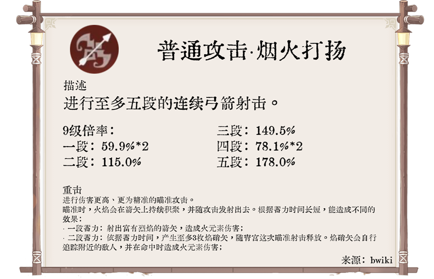 宵宫的主要输出手段是开E后的特殊普攻。其中宵宫的普攻是一套共计五段七箭的【烟火打扬】,倍率及描述如下: