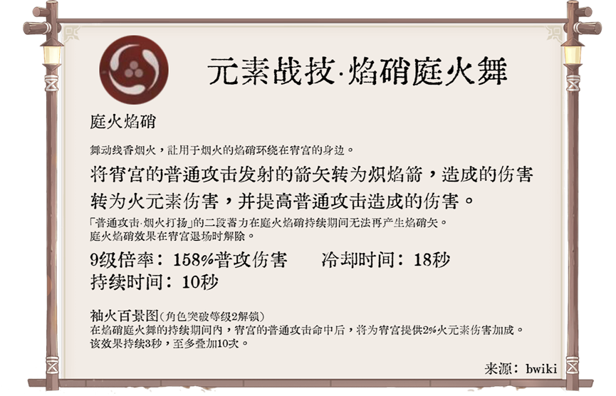 E技能也就是元素战技【焰硝庭火舞】,在使用后能将宵宫的普攻转化为火元素伤害,并提高普攻的倍率,提升值及具体描述如下。