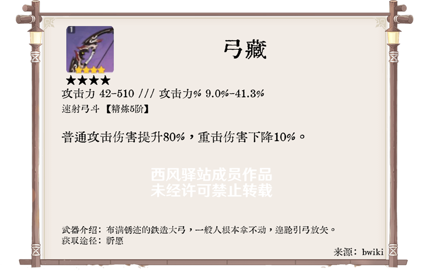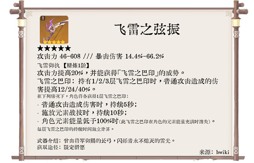 除了飞雷,我们还可以选择四星武器【弓藏】(精炼五阶),这把武器拥有着及其契合宵宫的武器效果,也就是最高可达80%的普攻伤害提升。
