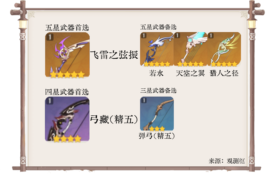 如果您没有飞雷或者高精炼等级的弓藏,也可以选择其他五星武器如【若水】、【猎人之径】和【天空之翼】。在某些条件下,用三星武器【弹弓】(精炼五阶)凑合一下也可以。