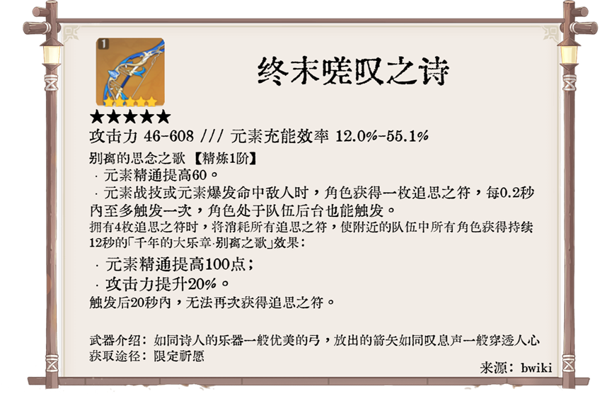 终末弓为宵宫提供开大所需的元素充能效率,而武器特效中也有至关重要的高额元素精通加成,因此可以作为烈绽放的武器选择。