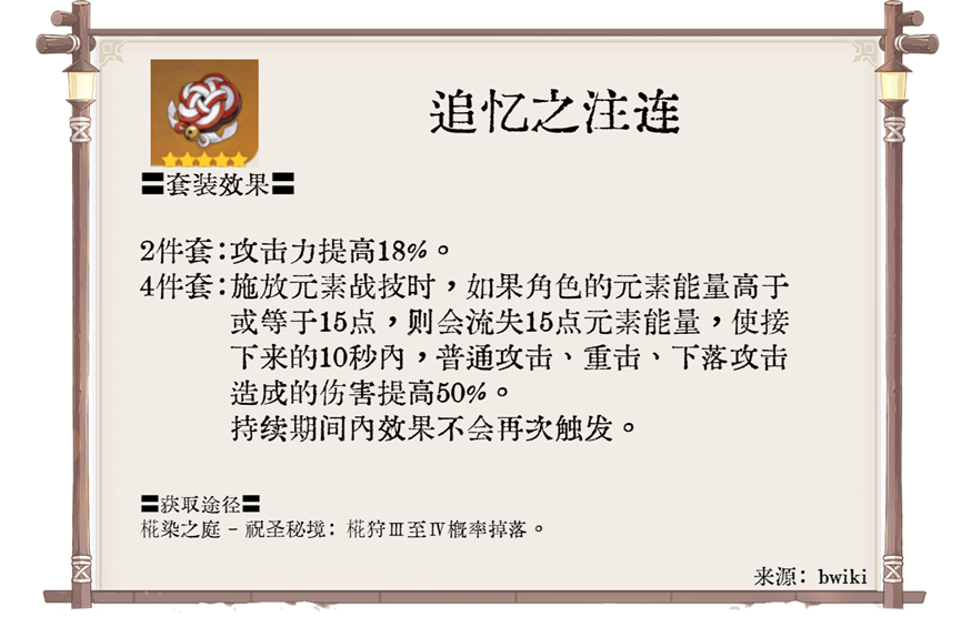 第一个要介绍的是很多人正在使用的【追忆之注连】四件套,它的特点是开E消耗能量,然后提升普攻伤害。这一点和飞雷的武器特效“角色元素能量低于100%时,将获得1层飞雷之巴印”倒是非常契合。