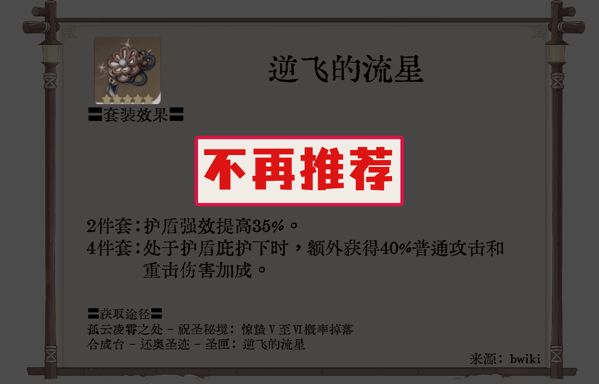 第二个是比较保守的【逆飞的流星】四件套,它提供的普攻伤害提升要低于追忆四件套,而且比起追忆二件套还少了18%攻击力加成,但是它为宵宫提供了35%护盾强效,变相提高了宵宫的生存能力,相对比较适合有盾无奶或者盾比较脆的阵容。