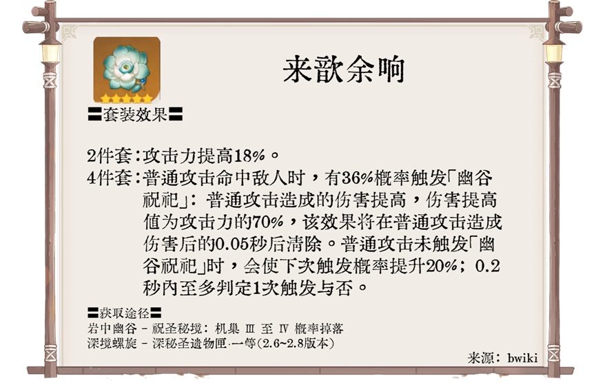 第三个是使用人数比较少但其实非常强劲的【来歆余响】四件套,它的效果描述看起来很麻烦,实际上理解起来也确实很麻烦,所以咱就不一一道来了,您只需要知道余响宵宫最终一套伤害打下来和追忆其实差得不多(±5%)就行。
