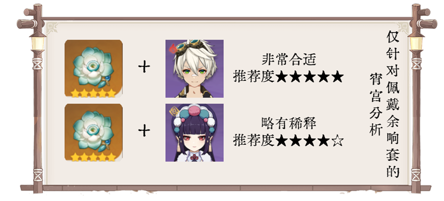 值得注意的是,余响四件套的效果对于带攻击力辅的宵宫阵容加成更大²,因此带余响套的话还是选班尼特比较好。