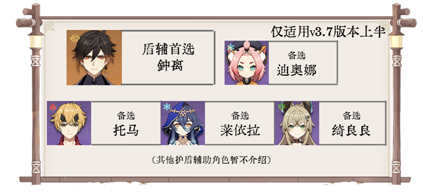 说到盾辅我们必然绕不开某位整天尘世闲游的往生堂客卿钟师傅。此外,能塞进宵宫队的还有地头蛇托马、猫猫迪奥娜、睡神莱依拉、以及即将登场的草猫猫绮良良。