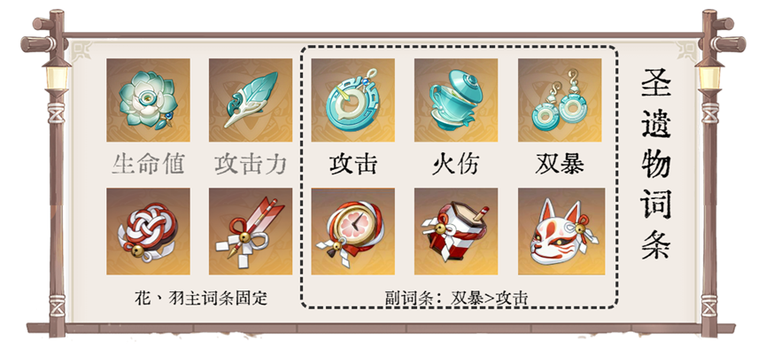 在这样一个主要靠火元素伤害输出的配队中,宵宫的圣遗物主副词条选择也很简单,您看下图就行: