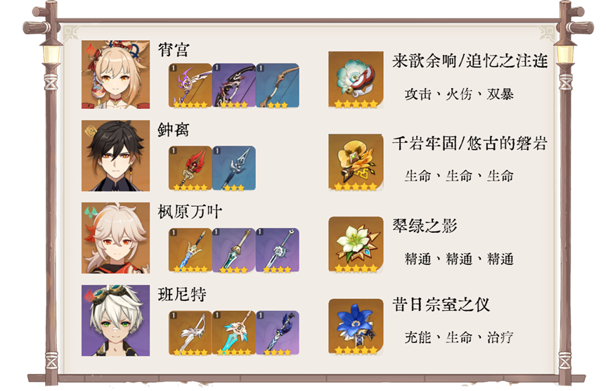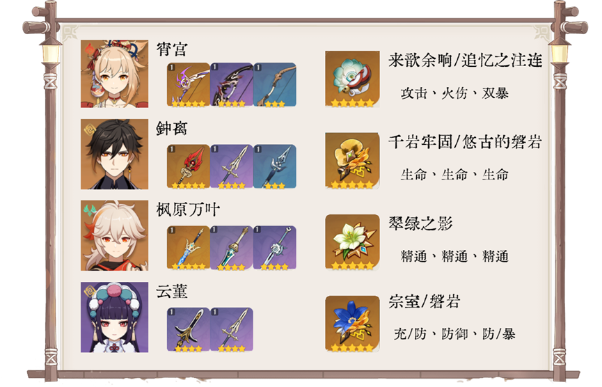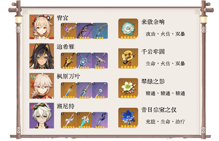好,到这里我们的宵宫纯火队就搭建完成了,为了方便您抄作业,我们准备了三张一图流配队指南,您按需选择即可。