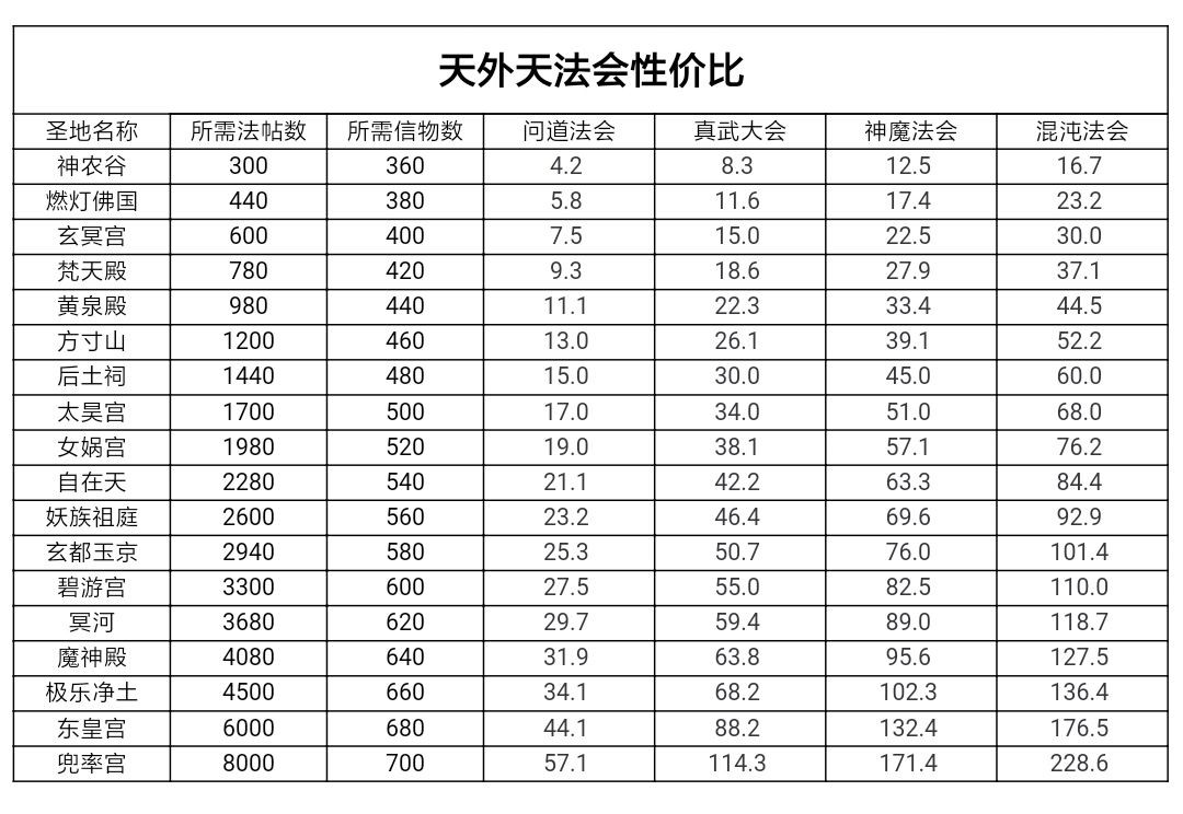 天外天法会选择克己律发布于 2020-07-23关注更新后新出的天外天法会,很多人面对这么多的法会不知该如何选择适合自己的法会参加。为此,我做了一个法会性价比统计表,对比大仙发帖来说明一下参加不同法会的价值。这个价值是指参加一天法会相当于多少大仙法帖。 根据表中数据,对于大多数普通玩家来说,最适合你得可能就是神魔法会。因为问道法会确实难打,非大佬打不过,等你能打过的时候,他的性价比已经不是最佳选择了。法会每天可以打一次,别忘了每天往前偷。但是要注意法会信物不能通用,所以凑够一个大仙信物再换别的天外天。来源于网络,侵删