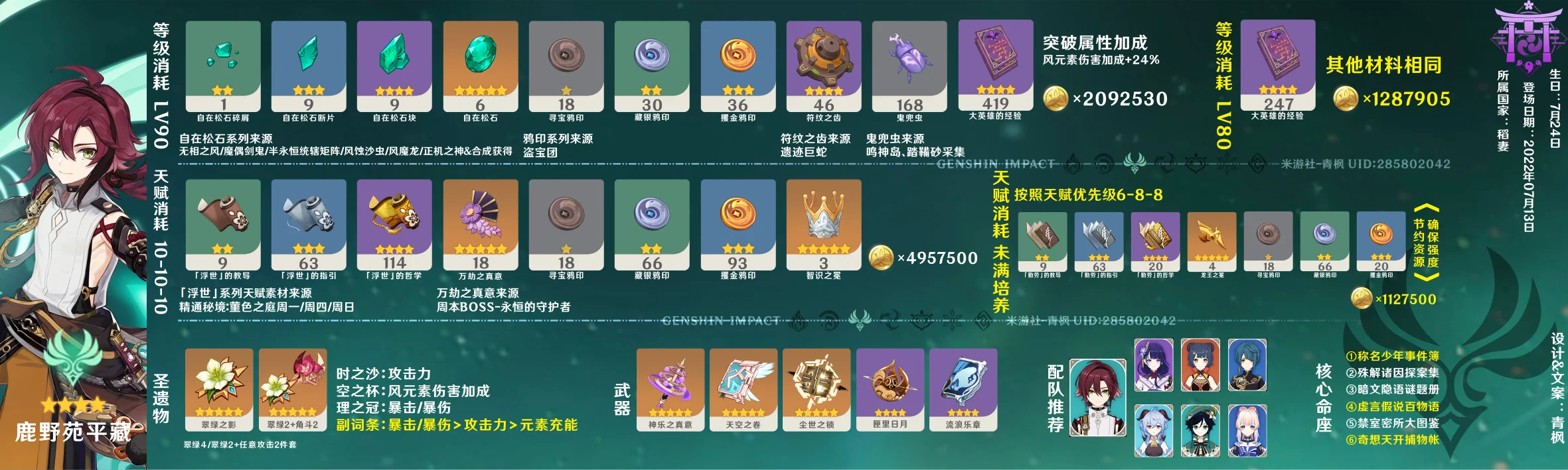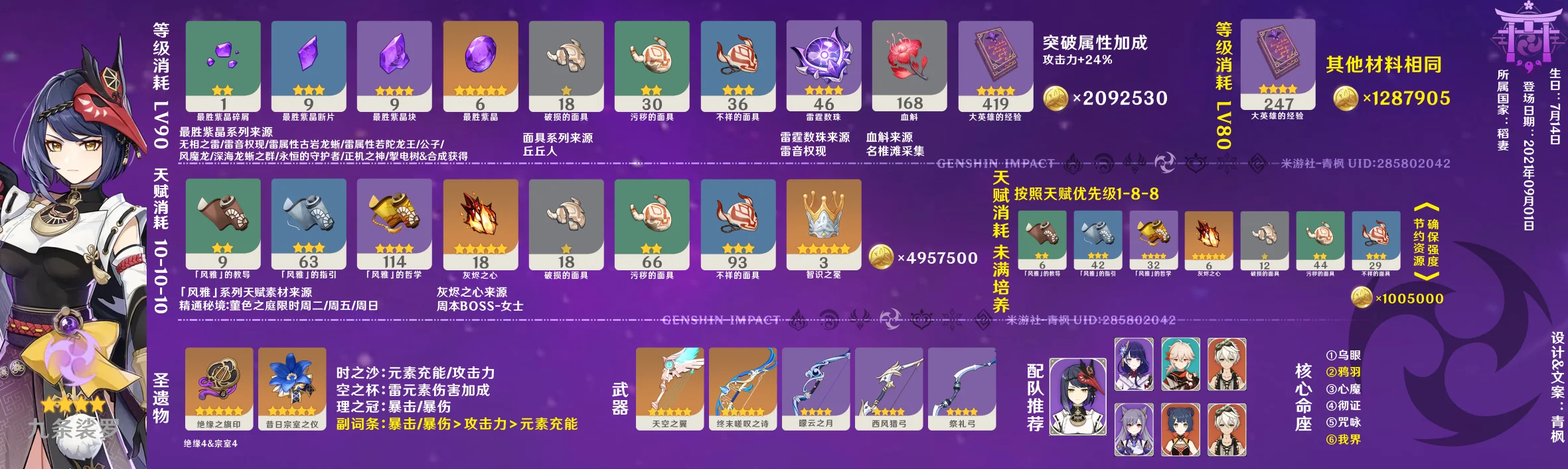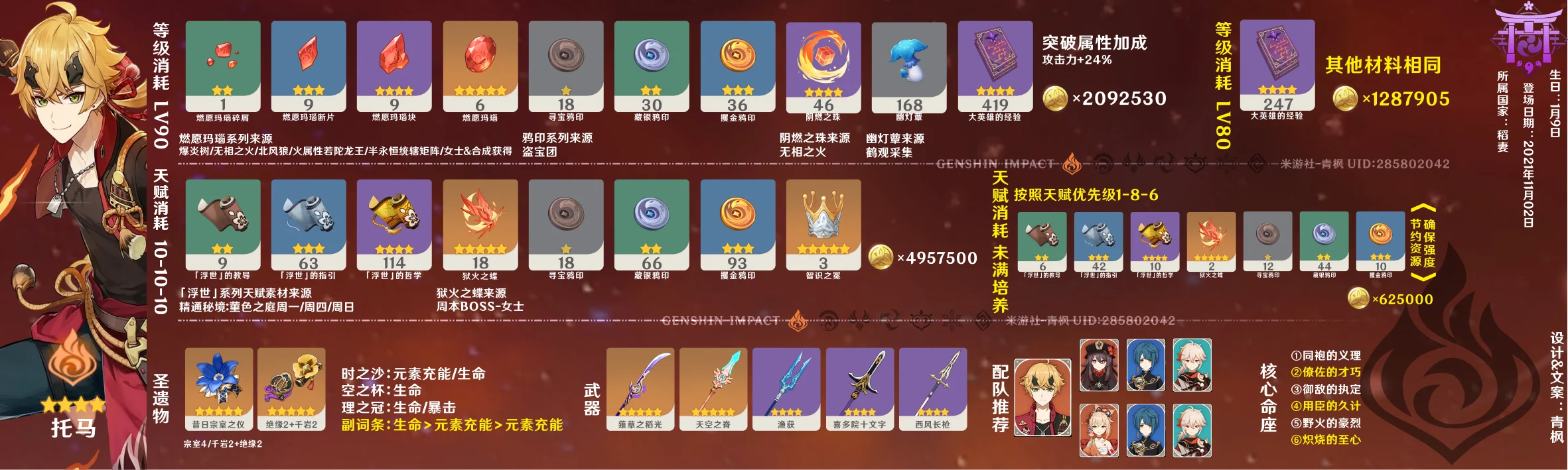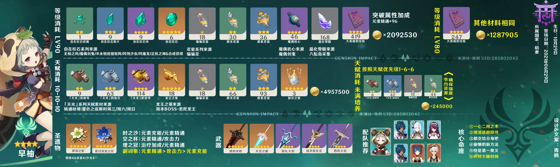 2、天赋消耗素材〈含天赋优先级推荐,优先升级角色的核心天赋技能,部分技能可暂时不点,保证角色强度同时节省不必要的资源消耗〉;