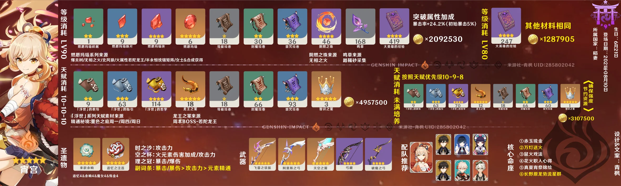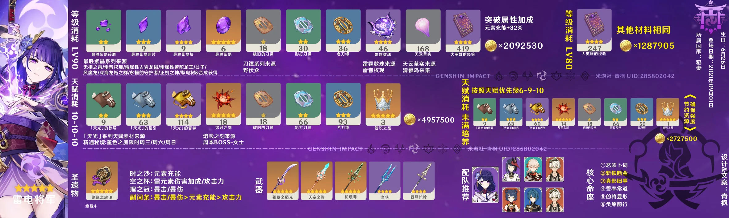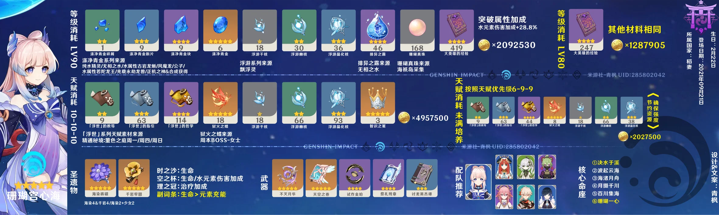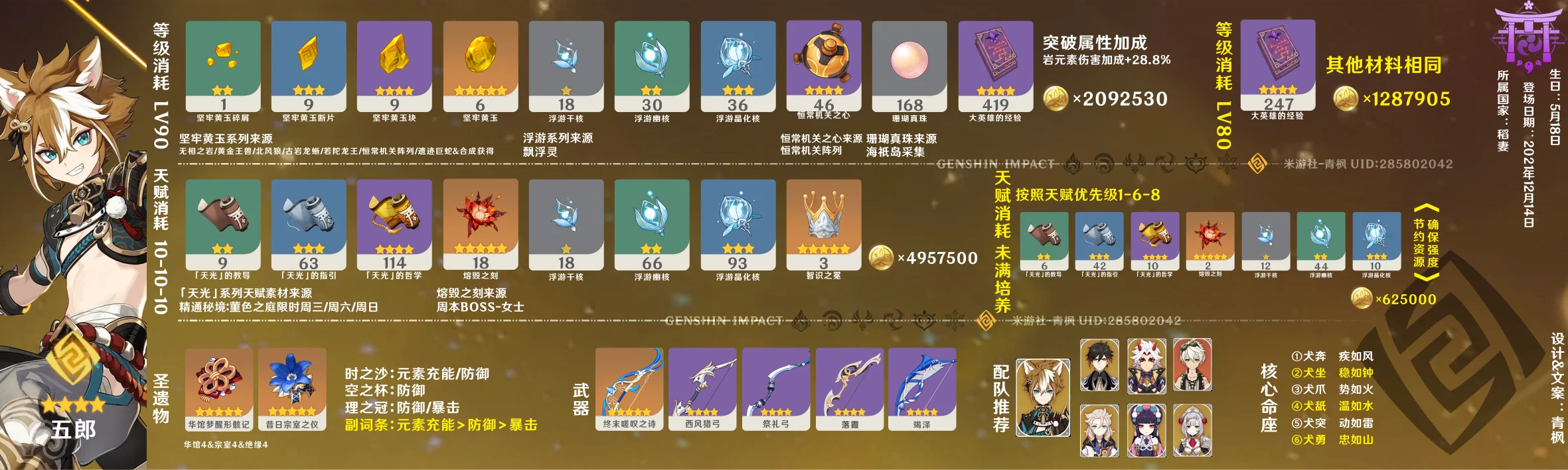 2、天赋消耗素材〈含天赋优先级推荐,优先升级角色的核心天赋技能,部分技能可暂时不点,保证角色强度同时节省不必要的资源消耗〉;
