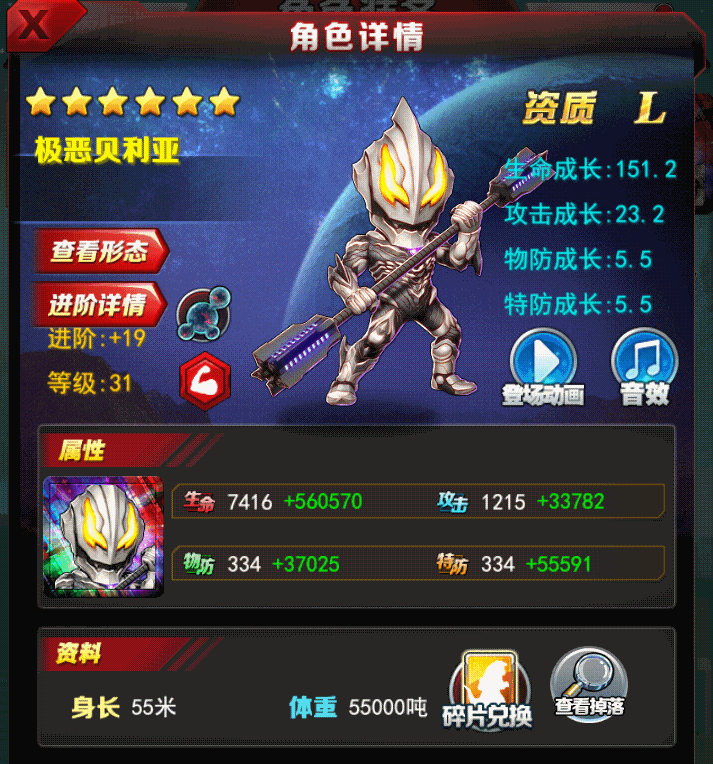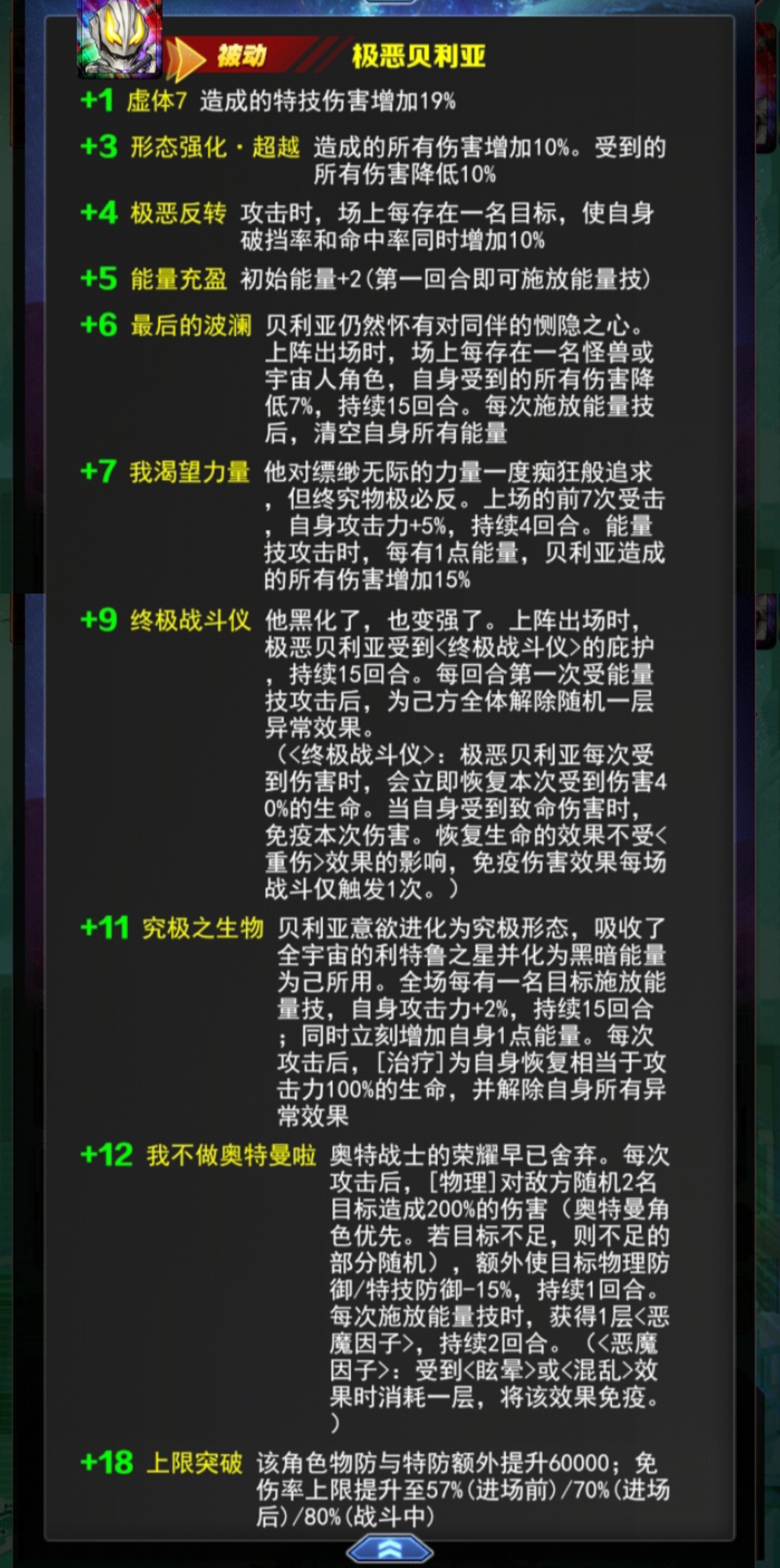解析:出场时场上没有一个怪兽或者宇宙人减伤7%。这个搭配谐振的话比较受益大。释放能量剂后,清空所有能量这个就比较拉了这个也只能打一次性的应为+7就是有一个能量+伤害所以可以搞能量阵容的。只能是把贝利亚放在后排,前排和后排的两个人都给他加能量。才能配合加7。打出高额伤害。或者被封技能。能量叠多了。一次打出来非常疼。这个搞俩奥搭配影响不大