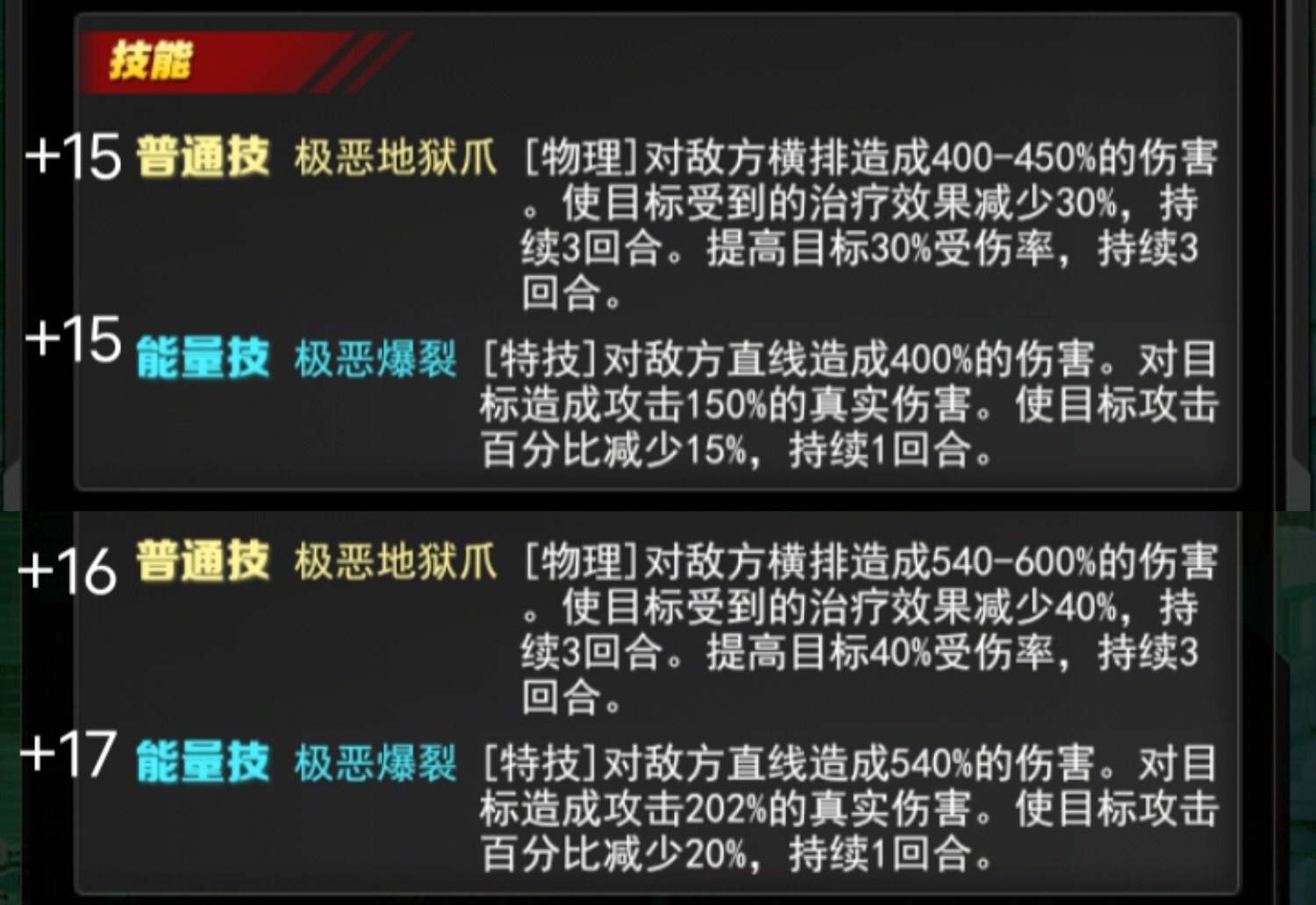 +16极恶地狱爪[物理]对敌方横排造成540-600%的伤害。使目标受到的治疗效果减少40%,持续3回合。提高目标40%受你率 持续3回合
