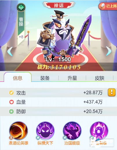 主动技能:随机对敌方3个目标造成攻击力188%的伤害,同时为全体友军增加曹操自身最大生命值15%的护盾(持续3回合)