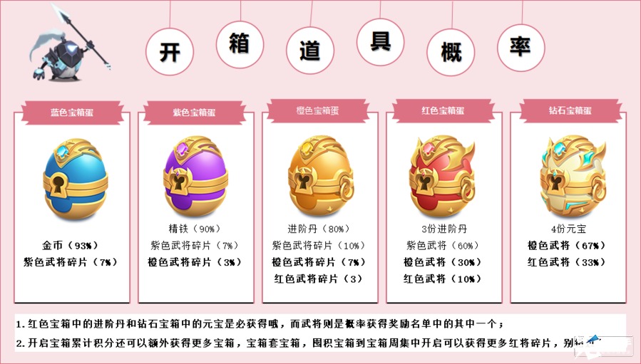 首当其冲宝箱蛋,宝箱蛋分五个品质,蓝色,紫色,橙色,红色和钻石蛋,开蛋除了可以获得武将碎片之外,还能获得各种升级武将和玩家角色的资源,详细的信息可以参考上表,无论是推图还是击杀每周boss或者击败入侵的圣兽等都可以获得道具蛋,开蛋奖励丰富,如果在活动周还能获得更多额外资源,各位小伙伴千万别错过~