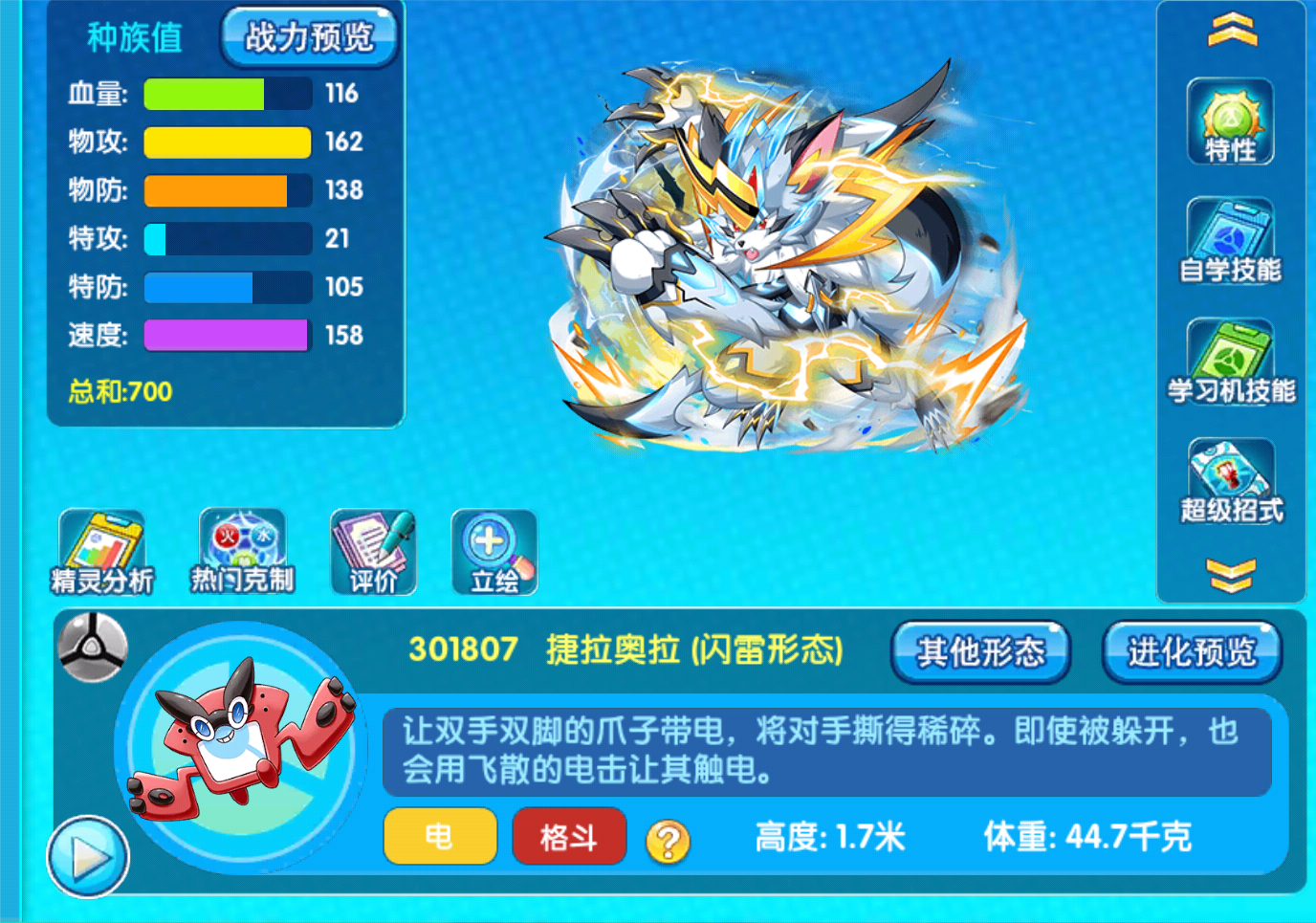 从种族值方面来说,本身是一个高速度,高伤害的宠物,虽然这个物攻面板看起来较低,但可以利用特性来弥补这个缺点,其他方面的话,就是一个简单的脆皮输出类型的配置,也别要求有多肉了,毕竟本身属性配置就不是特别的好格斗属性,虽然说增加了电猫的弱点,但同时也丰富了打击面,毕竟自身使用格斗属性拥有本系加成了。