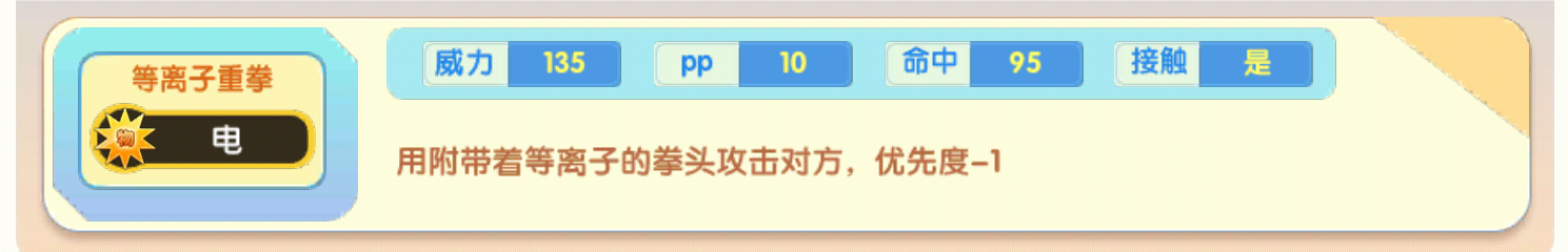 由于等离子重拳的副作用优先度会降低,那么正常来说,如果不激活这个特性,肯定会被对面的技能先打一下,但是由于这个特性的存在,可以无视该技能的,优先度减一的效果,只要自身的基础速度比对面快,那么打过去只要命中那这个技能就可以先手使用,另外的一个效果就是,如果自身的速度比对面快的话,就会获得减伤20%。