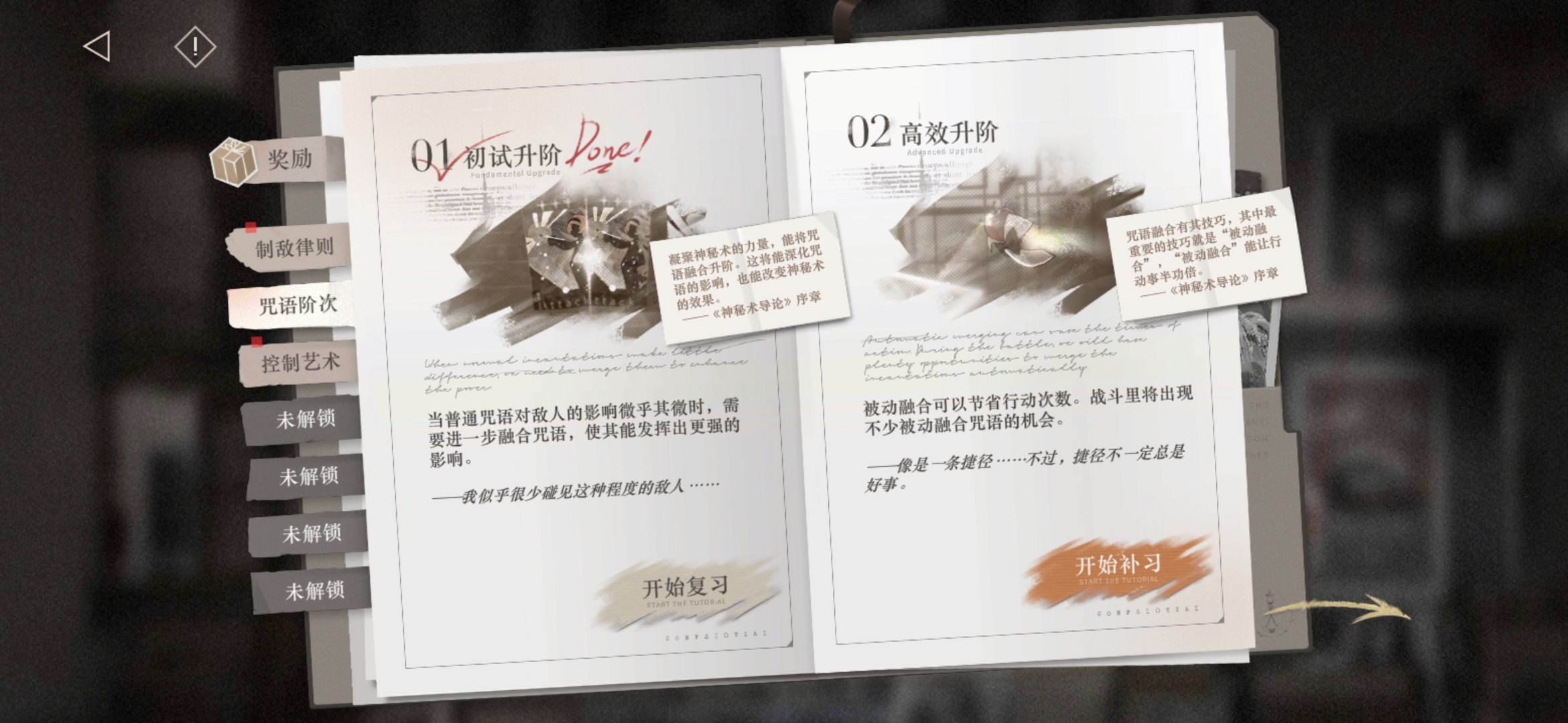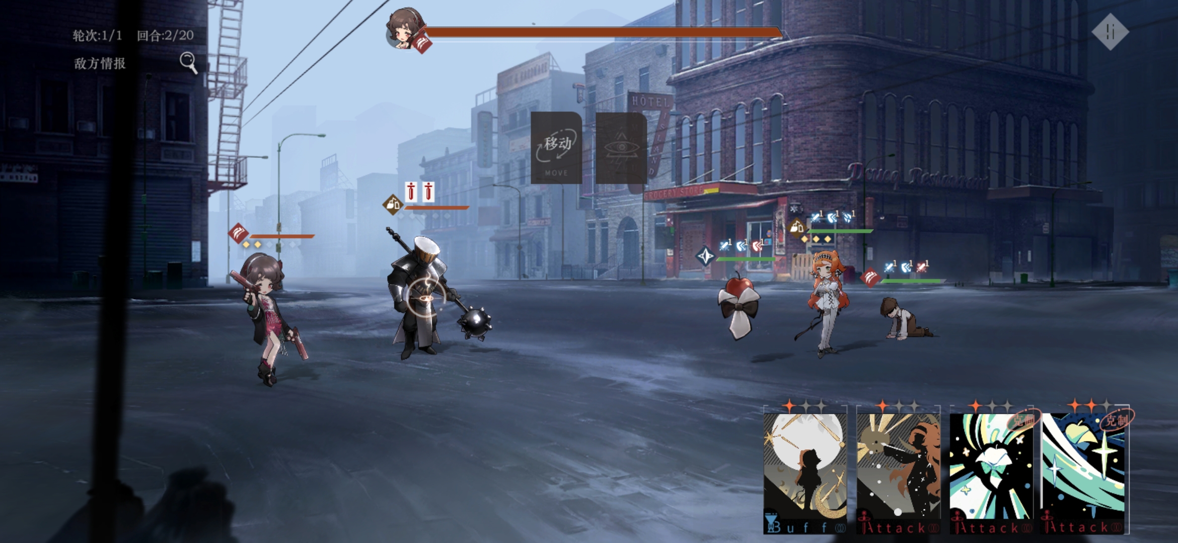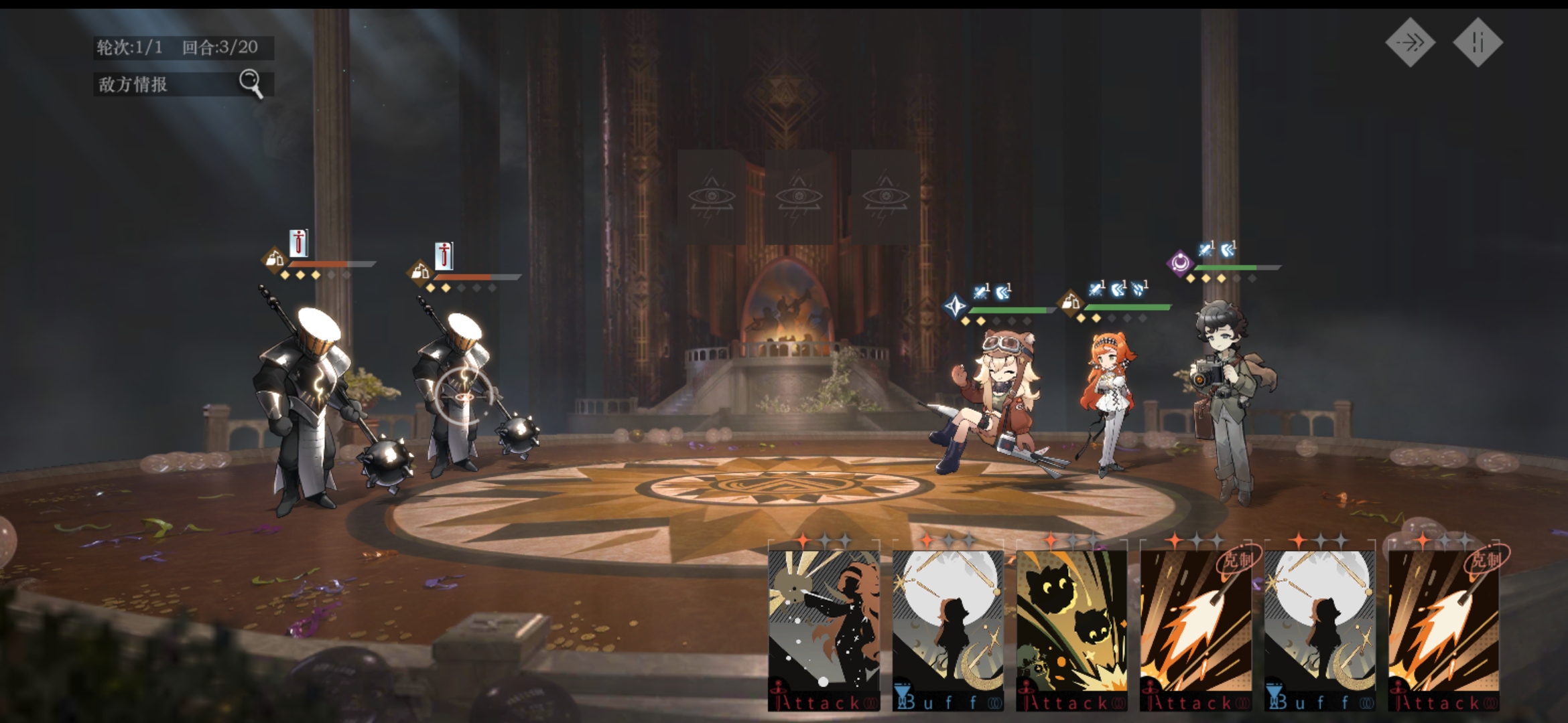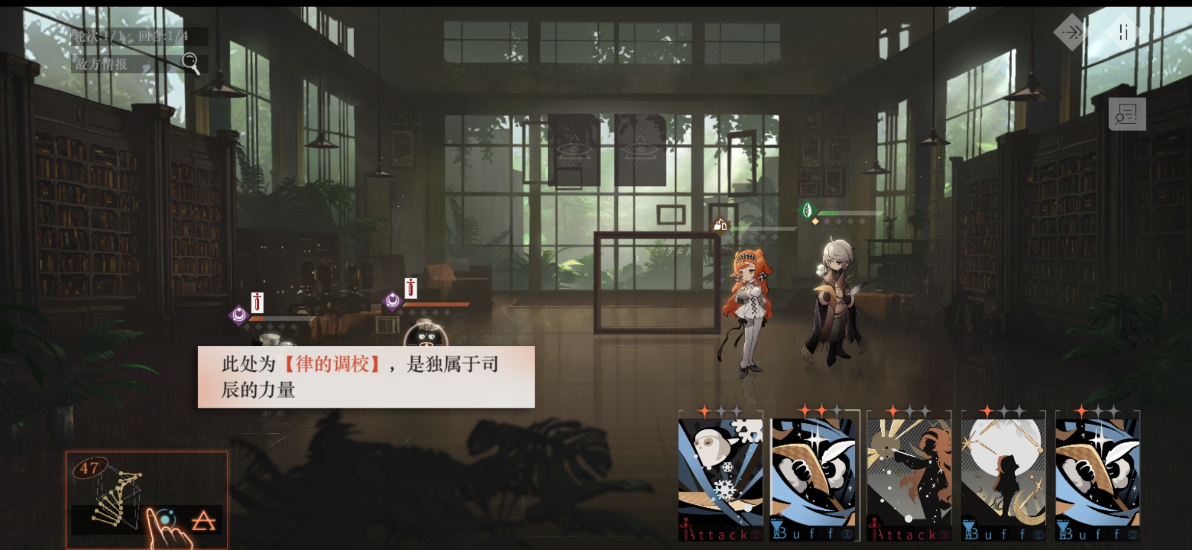在战斗中比如遇到这种两张相同卡牌之间包含着其他卡牌。可以先点中间的卡牌,然后两张卡牌自动就升星了,这样就不用手动移动浪费一个行动回合的次数了。先手点击敌人后面就会在下面的技能卡牌当中,右上角会有的克制关系,点击克制的卡牌,打击敌人,效力加倍。每使用一次角色的咒语,角色就会增加激情,激情到达最高点时就会释放大招卡牌。