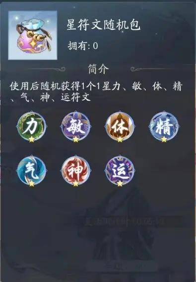 ①符文一共7种:力、敏、体、精、气、神、运,其中运的获取几率最低,根据玩家间的不严谨说法只有5%左右的几率开出来,同时神祝搭配中带上运的确实效果要比其他的略强,所以祝大家开袋子多多出运;