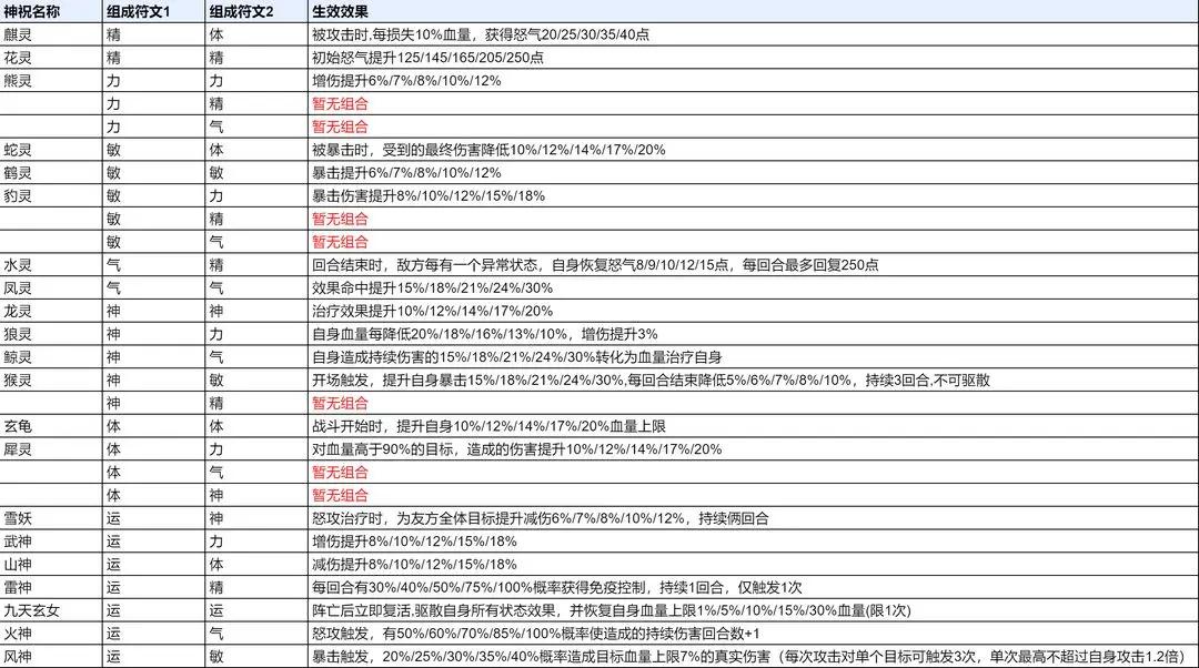 ②每个神祝位可以装入两张符文,不同的两个符文可以搭配激活不一样的神祝效果,搭配效果图鉴见下文表格,引用于攻略组资料,感谢感谢;