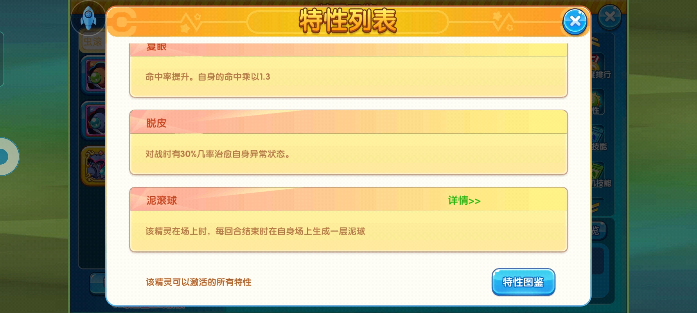 特性主要介绍泥滚球,效果是该精灵在场上时,每回合结束时在自身场上生成一层泥球,而泥球可以为携带泥滚球特性的精灵,提供每层5%的伤害减免和10%的物攻加成,并且泥球状态为场上状态,产生后一直存在与我方场上,最多10层,还有同样为泥滚球特性的不同精灵可以合作叠加泥球的层数,也可以享受泥球的加成,这个特性本身是一种状态,因为不是障碍物,所以目前版本无法被清除,当然不知道后面版本会不会安排大扫除之类的技能给清除,但是现在版本就是长久存在的。