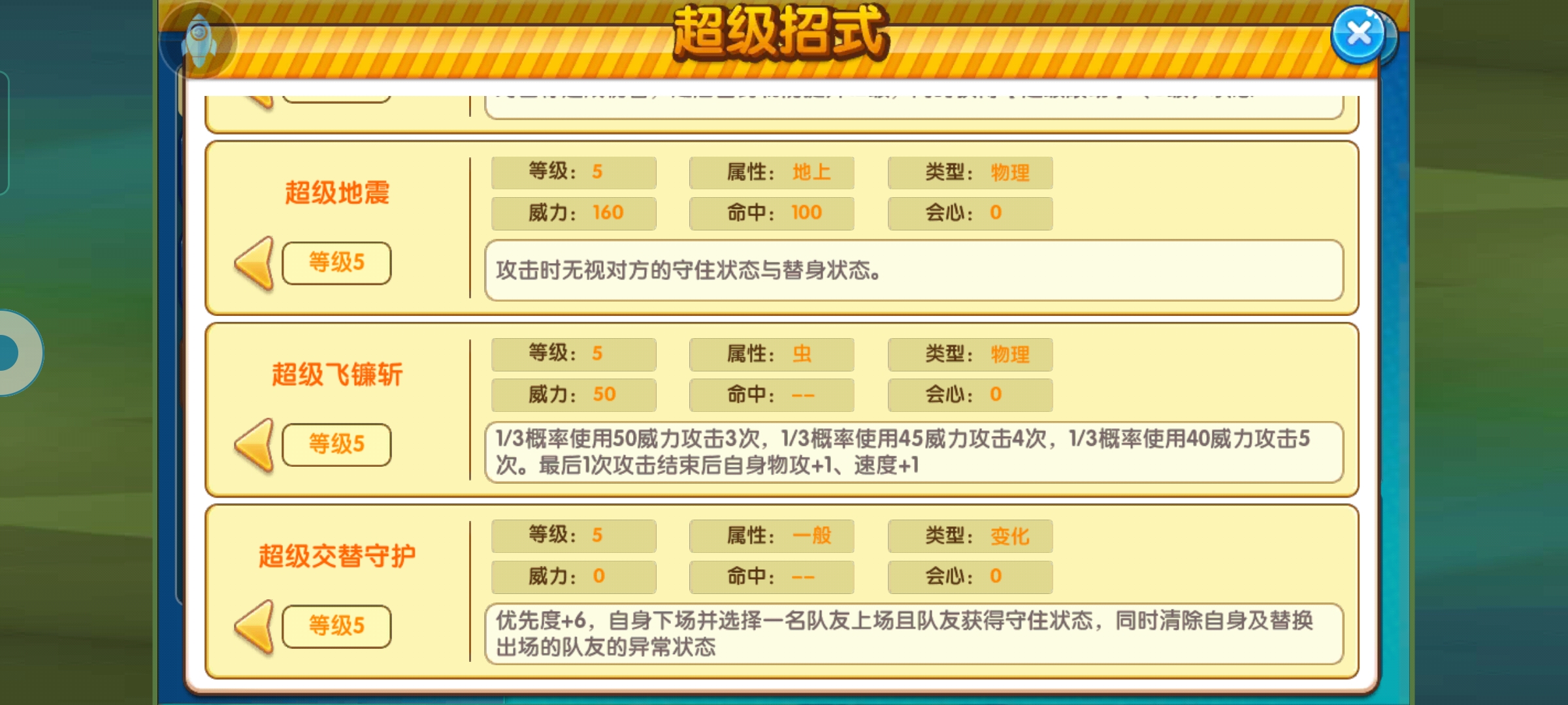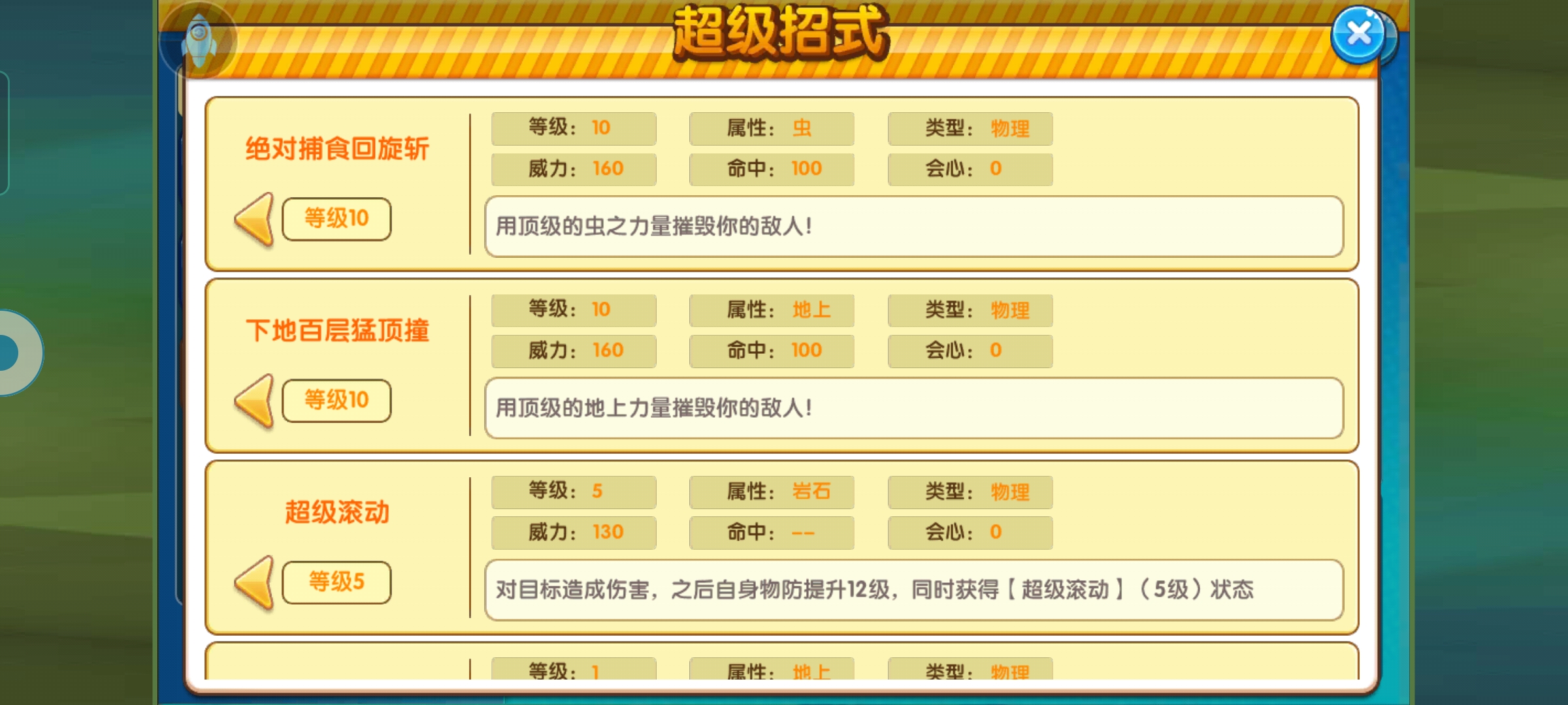 大招有6个,个人建议开超级滚动或者超级地震,超级滚动可以直接把物防叠满,在对方只剩下物攻宠时,找个机会开大,叠满防御后和对方硬刚,反正自身因为特性原因会越叠越硬,越叠越暴力,只要前面抗住拉住血,后面就可以反杀对方,再或者超级地震作为本系Z大招,拥有160的高威力,如果玩输出的话,在自身伤害起来后用这个大招伤害更高,而且还有本系加成,攻击还可以防止对方守住、替身防守。