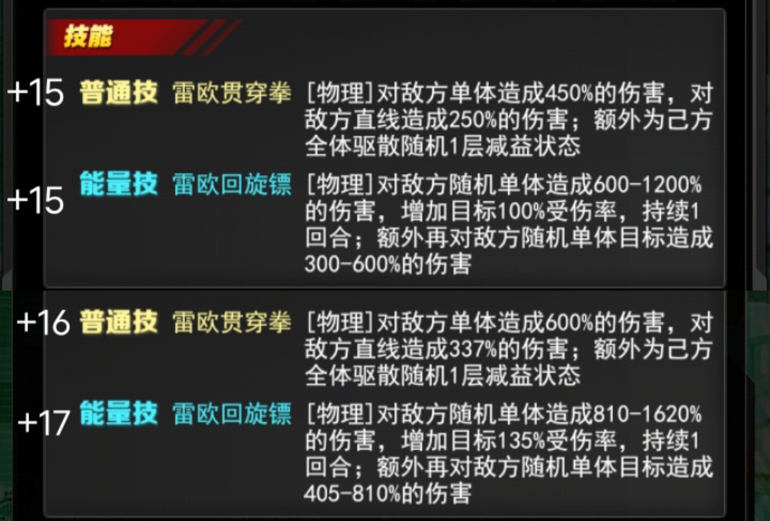 +17能量技 雷欧回旋镖[物理]对敌方随机单体造成810-1620%的伤害,增加目标135%受伤率,持续1回合;额外再对敌方随机单体目标造成405-810%的伤害