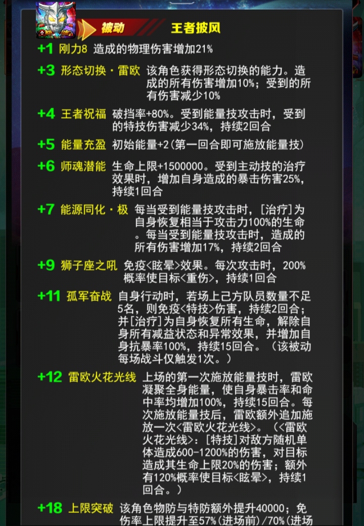 解析:本次改动的核心了一次用能量技能以后加暴击加命中100但是只有一会经过改动很不错了十五回合,追击一个大招重点来了每一次释放能量技能追击一次还有一个真实伤害这个就是对闪卡好打了,要是有个队友可以炮灰全部清除,大招踢主力,追击主力都打到主力上伤害是真的高这一套打在一个人身上简直就是相当炸裂的这个伤害现在这个雷欧可玩性很高建议单推