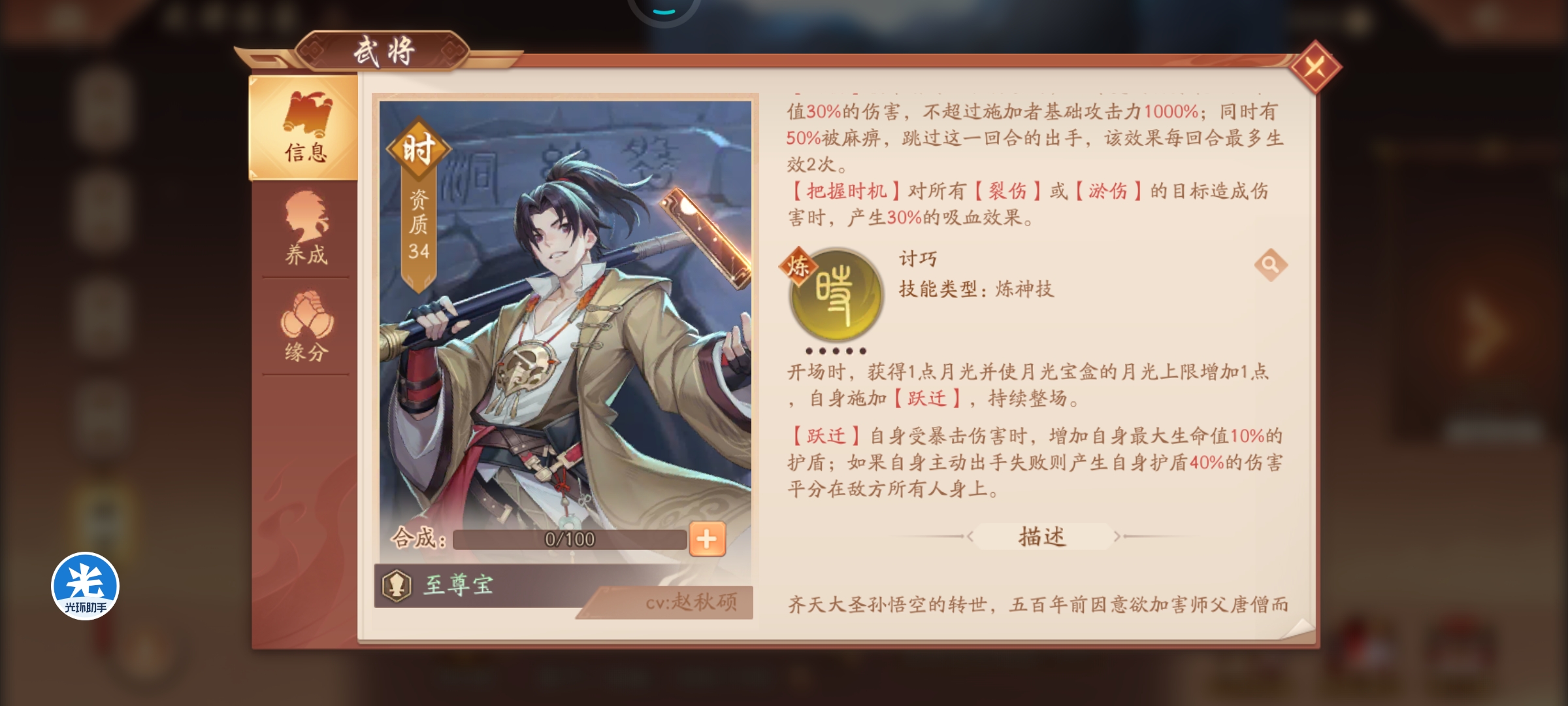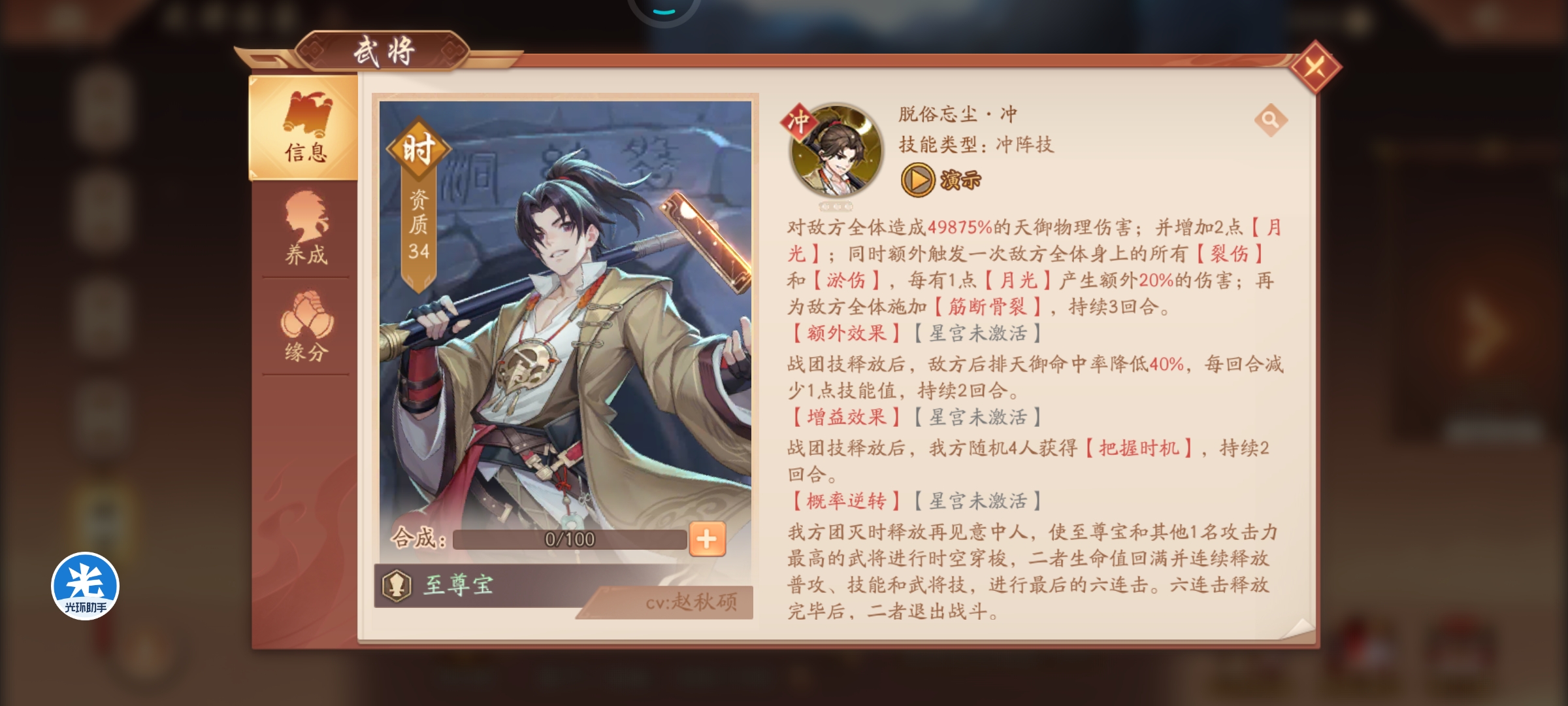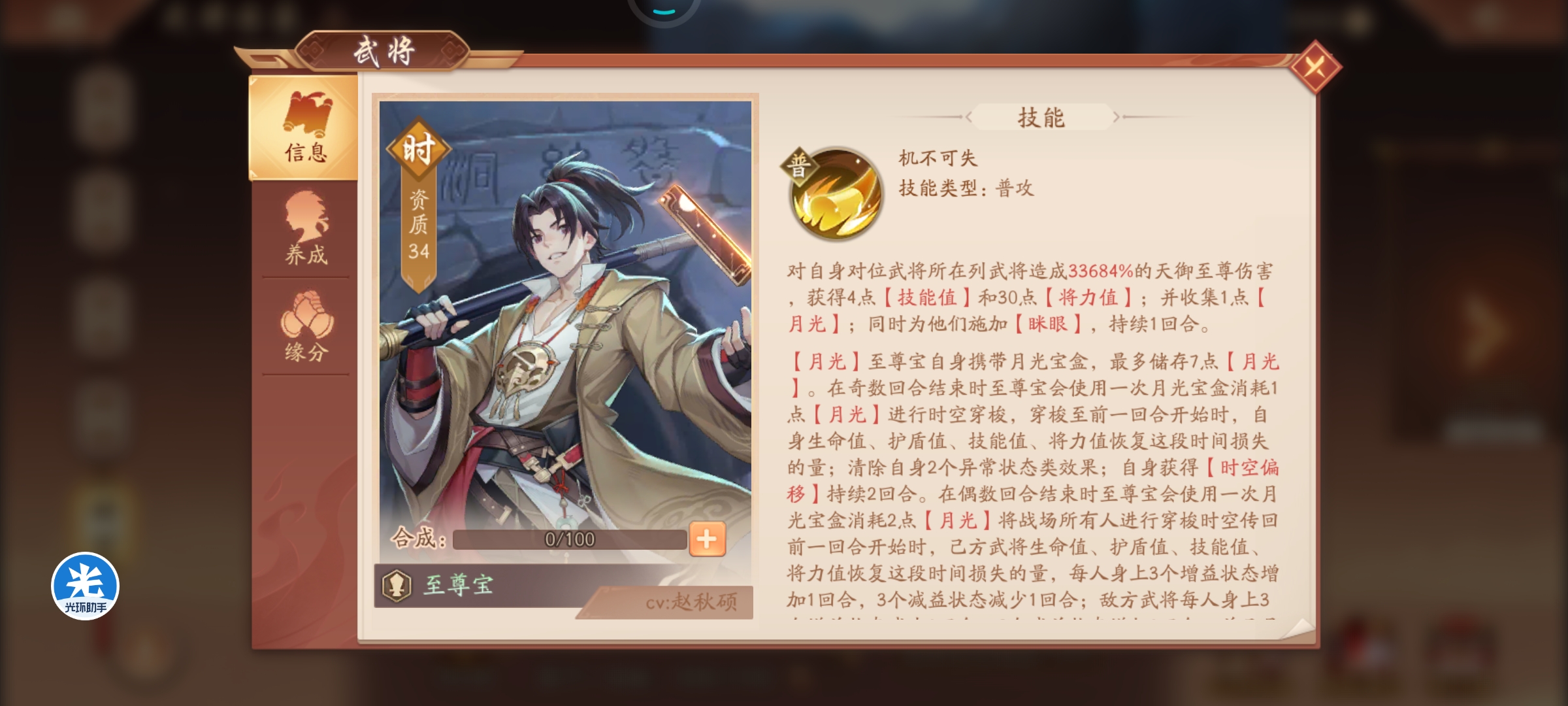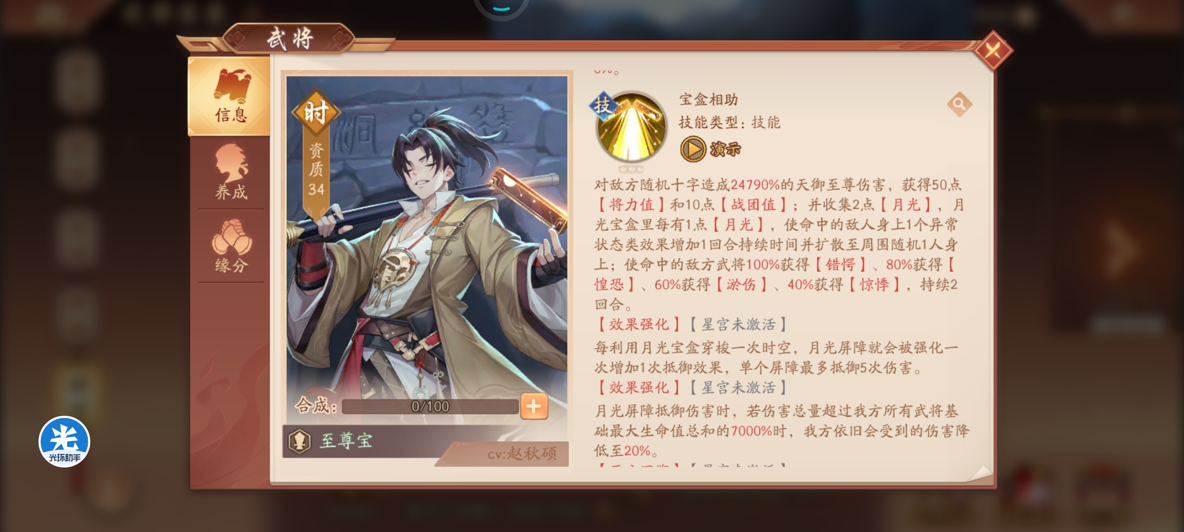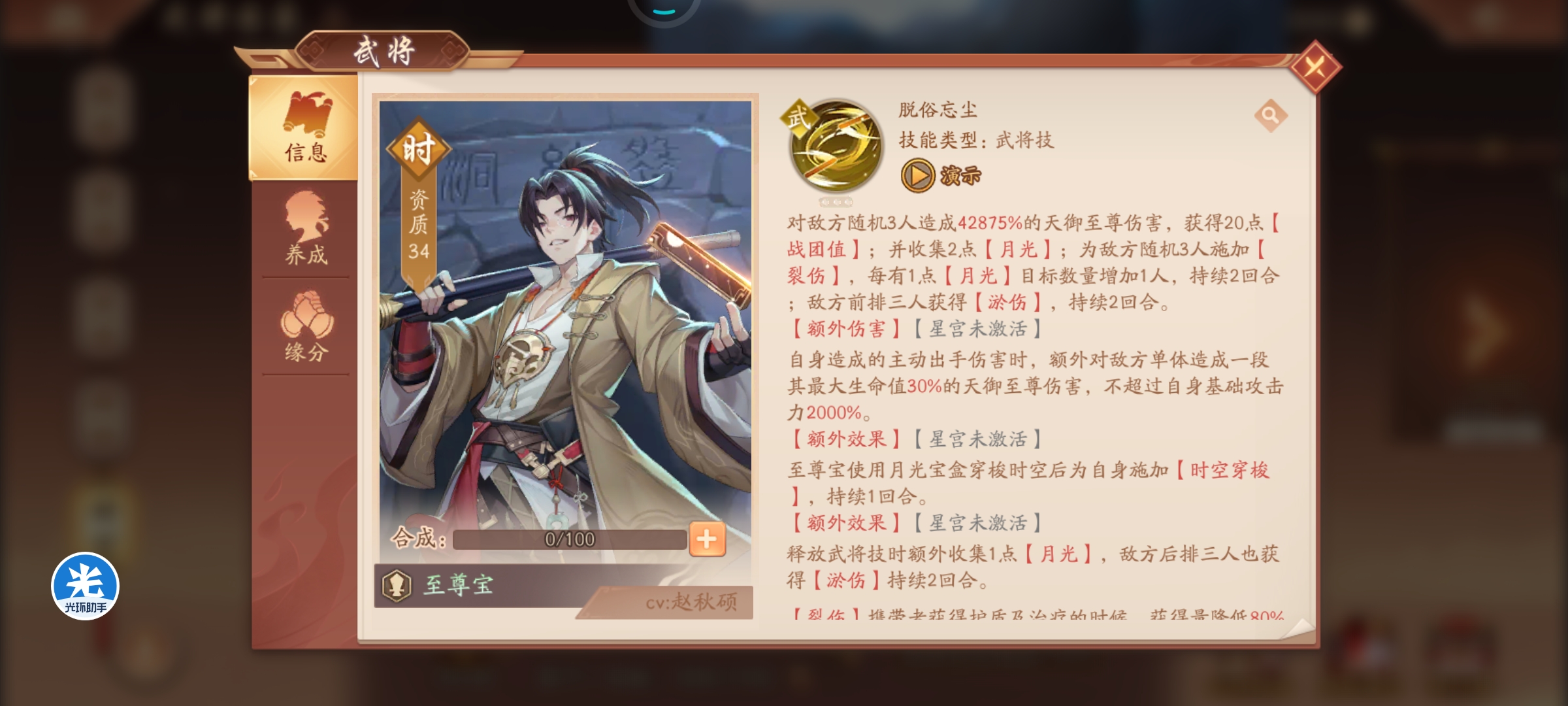 总结:白板完全能用,月光每回合穿梭恢复的状态就很多了 完事有个月光屏障减伤,很厉害的辅助了,异常伤害也有,后面再考虑补星点满战团,为什么我说下个品质还能用?还是因为他这个团灭后的独特机制,还能带着下一个品质的主力武将释放普攻,技能,武技。