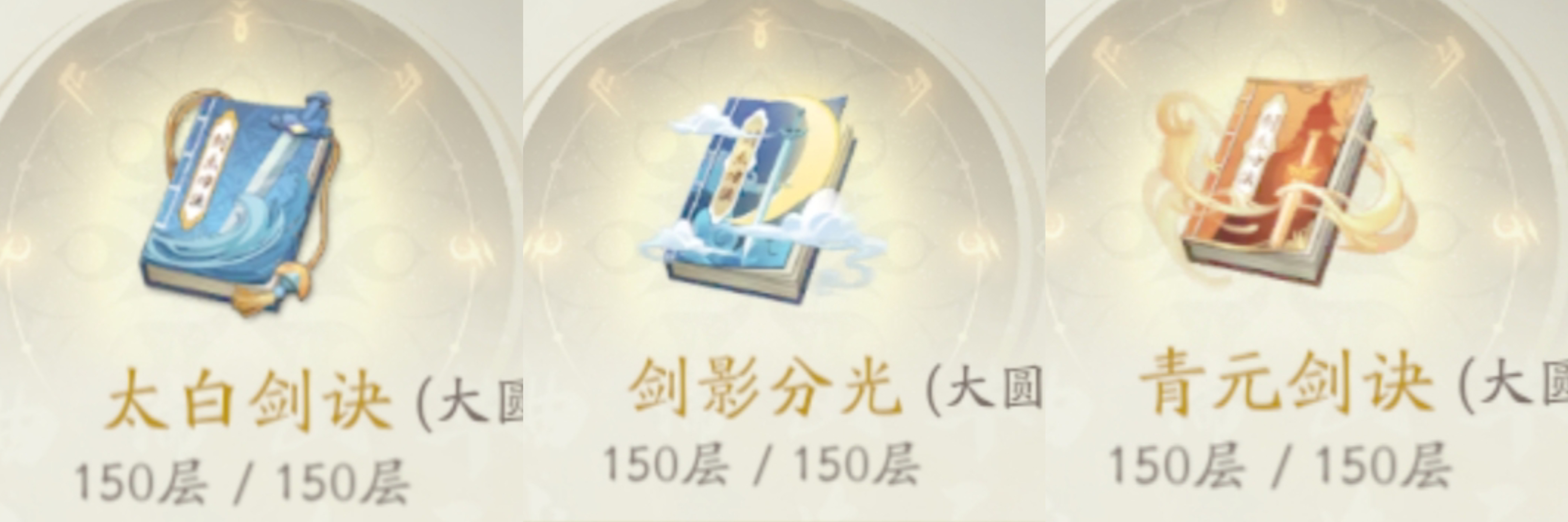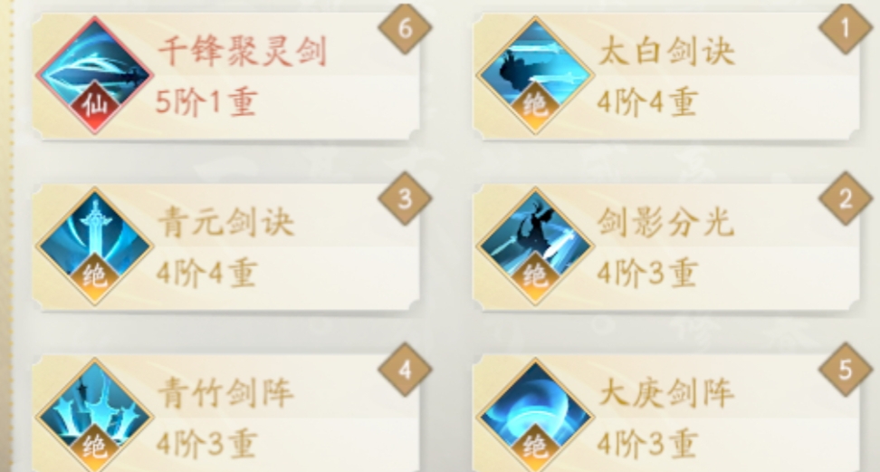 ①太白剑决+②剑影分光+③青元剑决+④青竹剑阵+⑤太庚剑阵+⑥千峰聚灵剑。