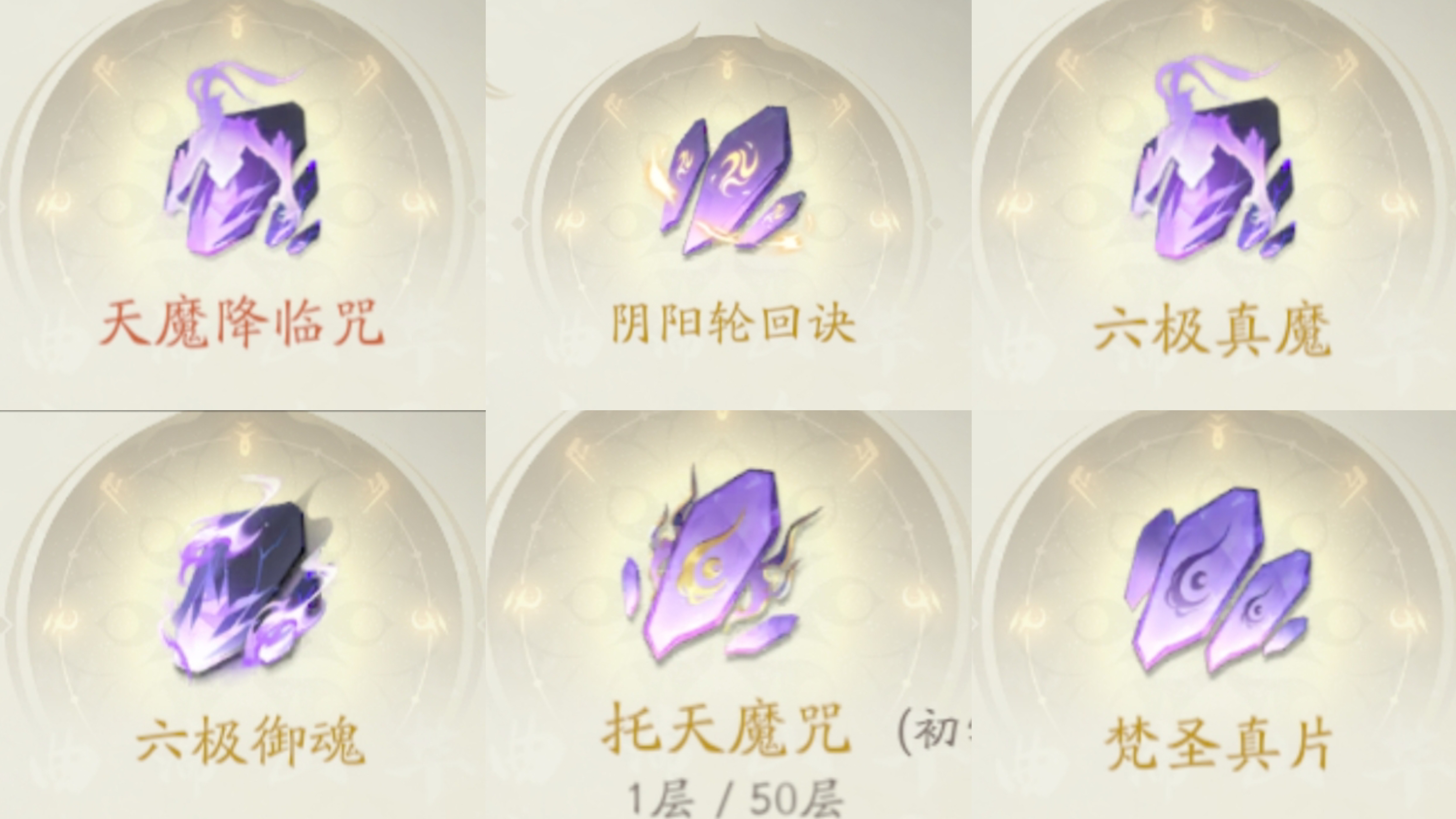 ①天魔降临咒+②阴阳轮回决+③六级真魔+④六极御魂+⑤托天魔咒+⑥梵圣真片